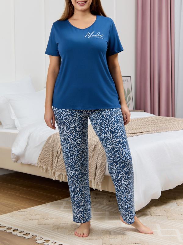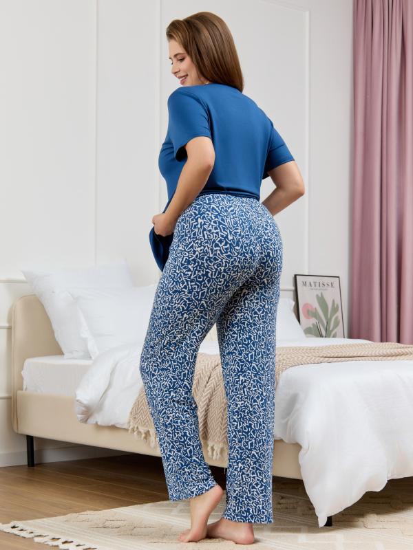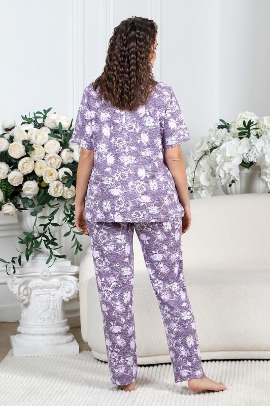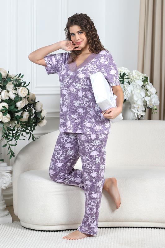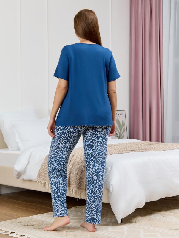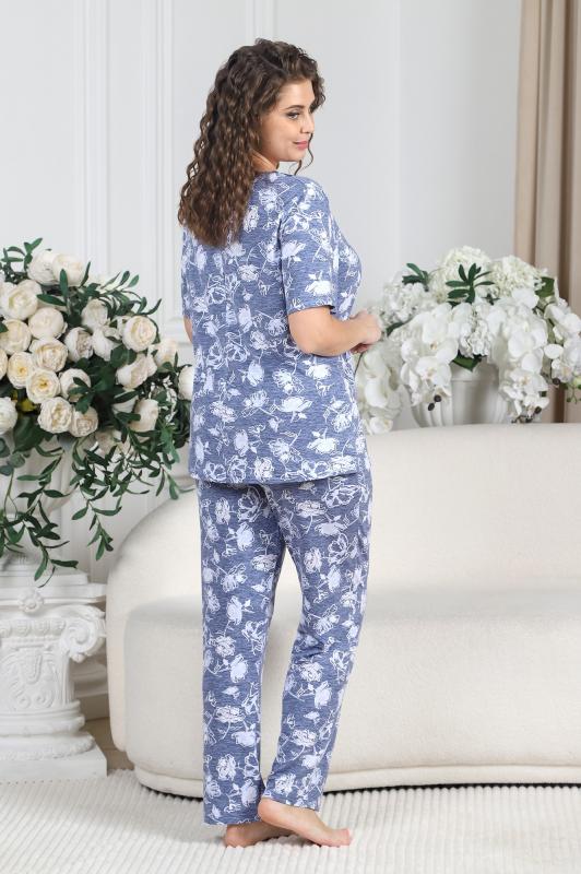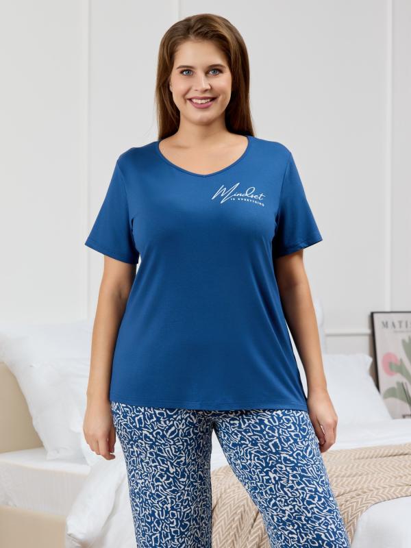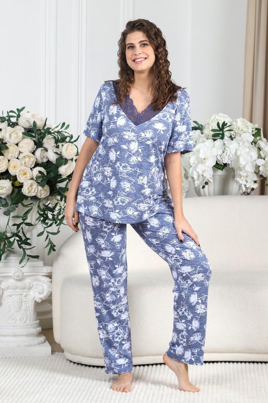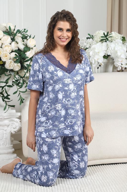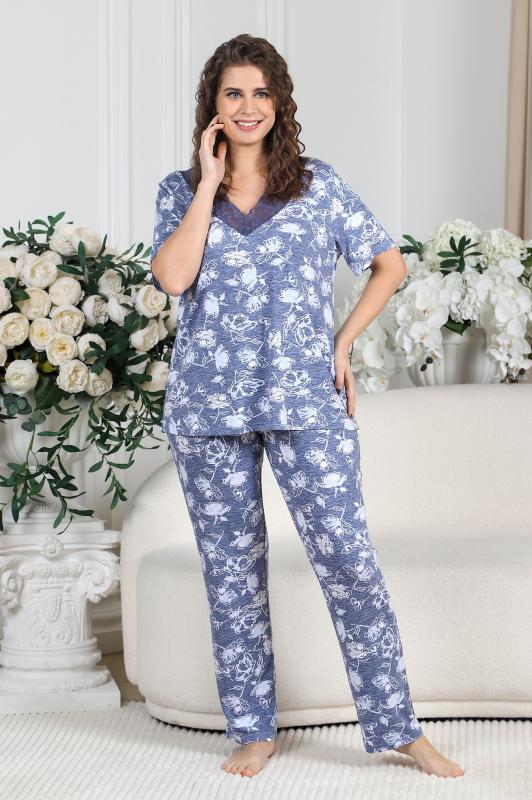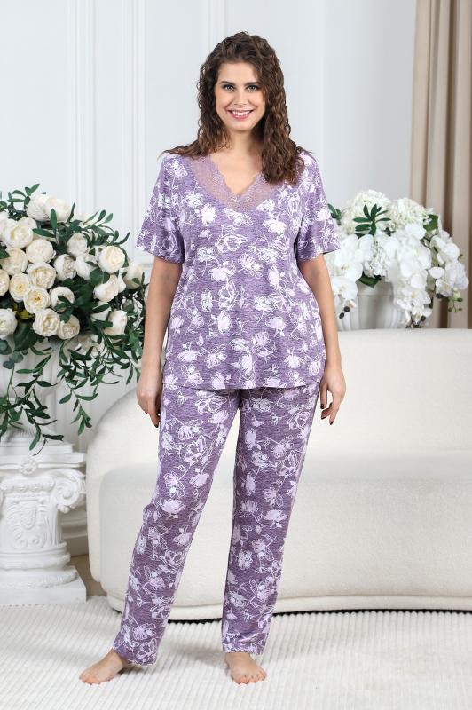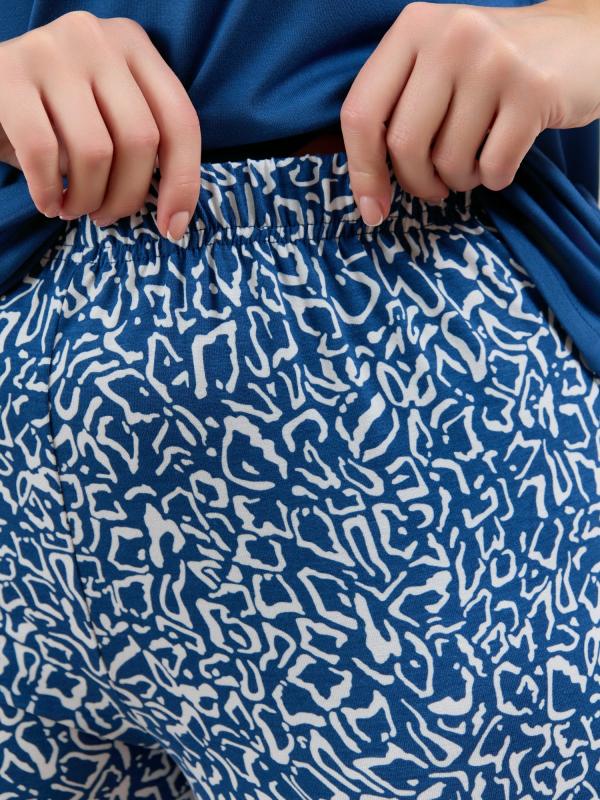 Пижама женская из вискозного трикотажного полотна с набивным рисунком, состоящая из футболки и брюк. Футболка – прямая, с короткими втачными рукавами. Полочка с V – образными кружевными деталями по горловине.Брюки - свободного покроя с эластичной тесьмой по талии.