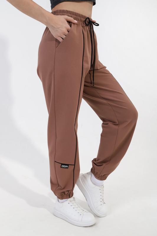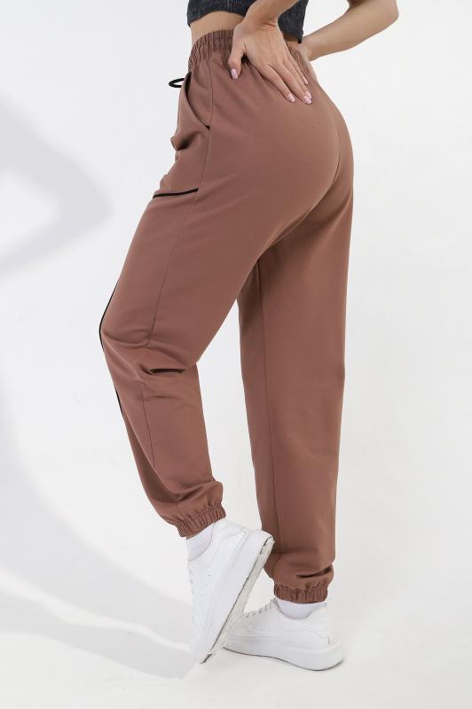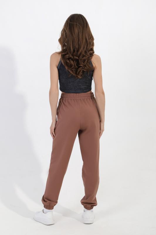 Брюки женские из трикотажного полотна «футер-двунитка», длинные, полуприлегающего силуэта, на притачном поясе с эластичной тесьмой внутри и карманами в боковых швах. Передние половины застрочены по центральным линиям, на задних половинах обработаны две вытачки в области талии.