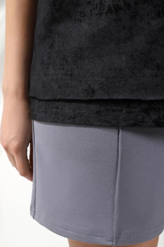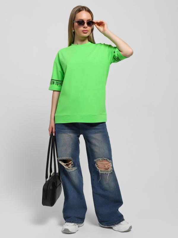, модного силуэта, слегка укороченная, свободного покроя, с приспущенным плечом, втачными рукавами длиной до локтя, горловиной овальной формы, обработанной втачной планкой и принтом в центре переда. По шву втачивания планки настрочена отделочная строчка. Низ изделия и нижние срезы рукавов обработаны швом вподгибку.