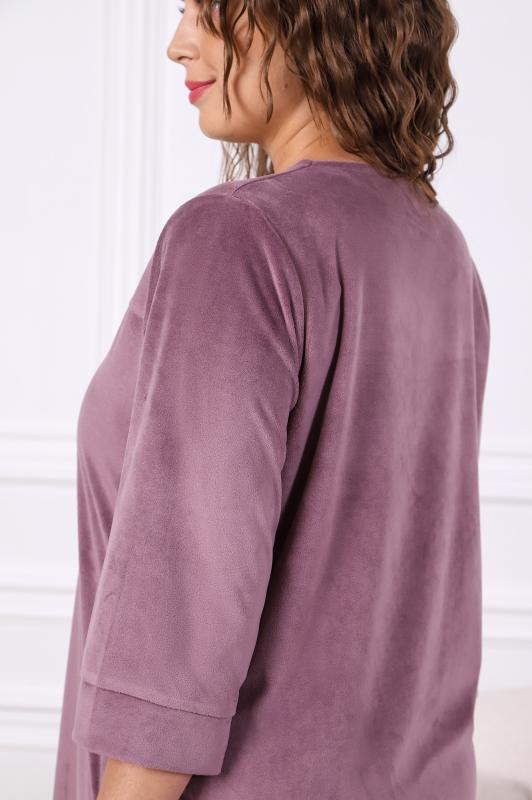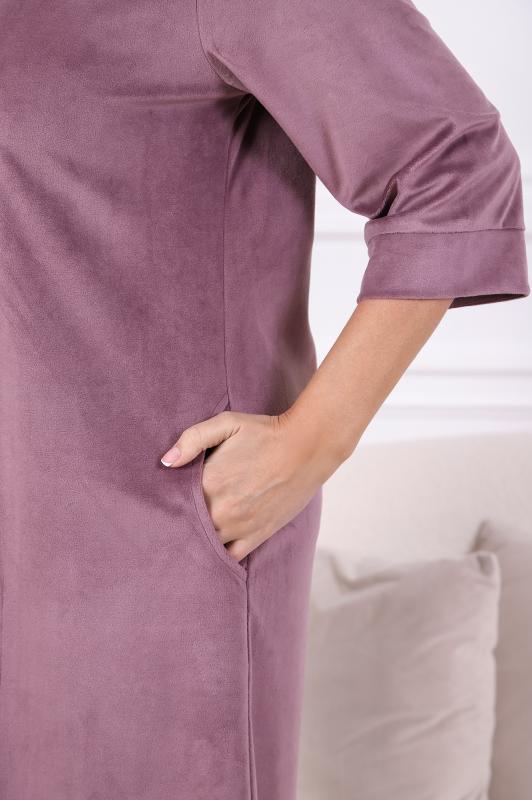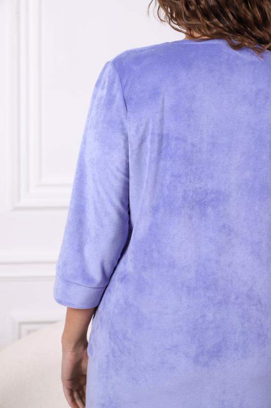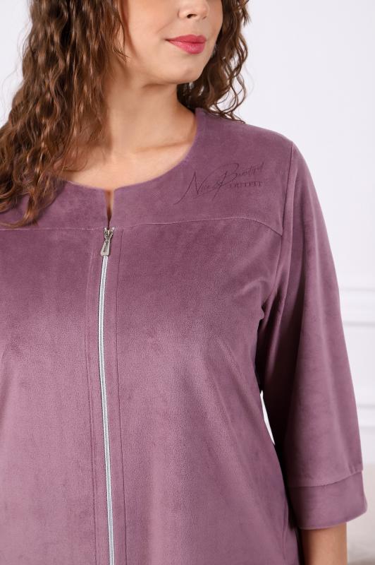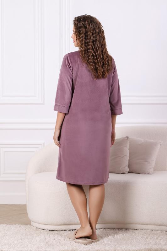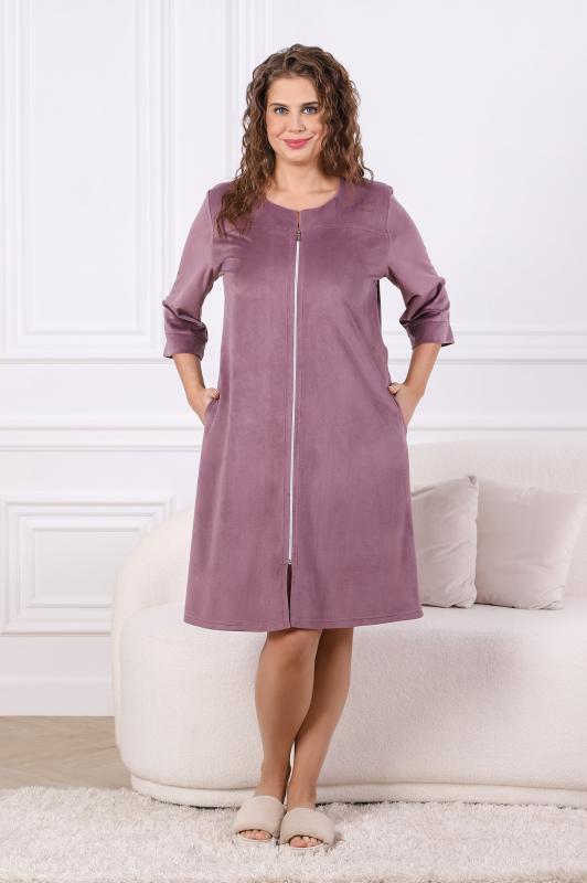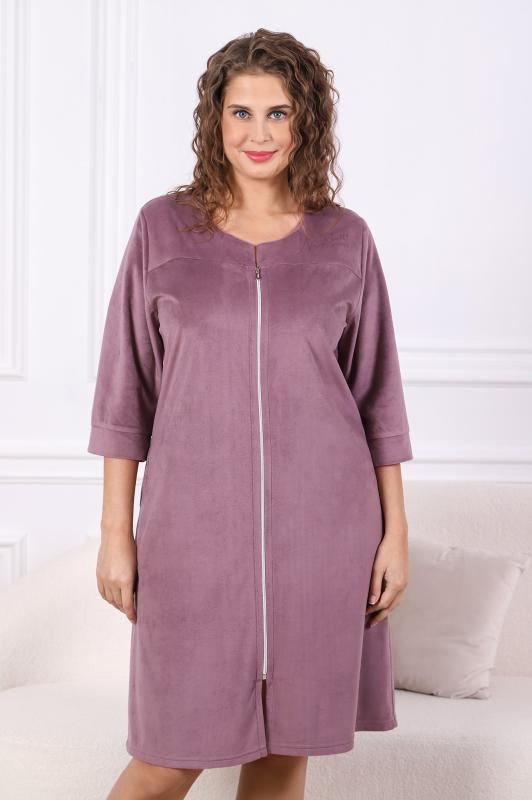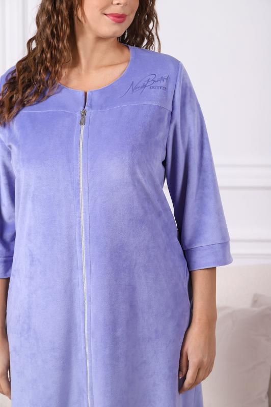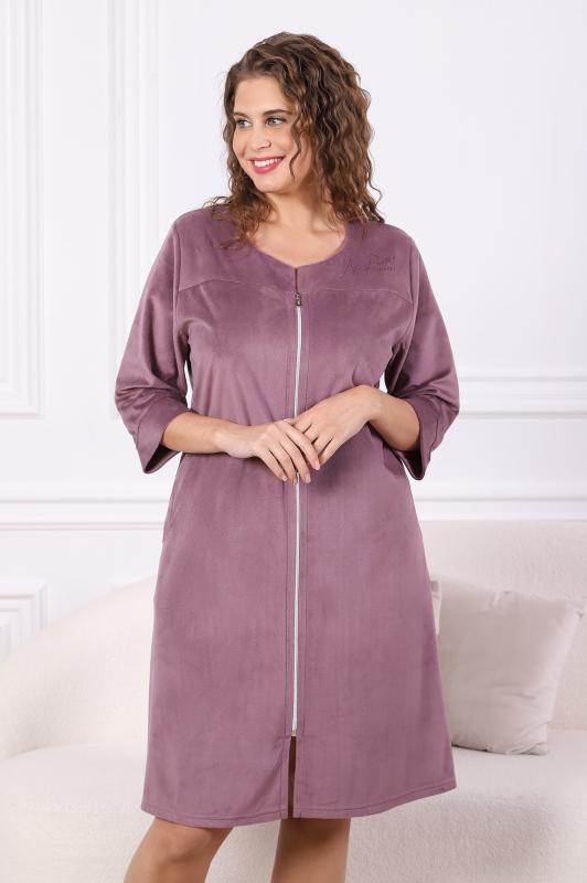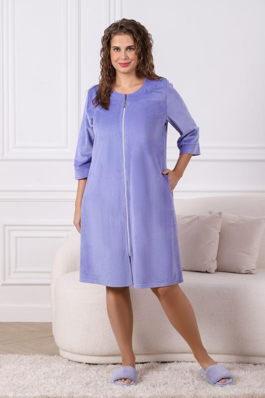Халат женский из трикотажного полотна «вельмонд», прямого силуэта, с втачными рукавами длиной ¾, карманами в боковых швах, горловиной v-образной формы, переходящей в центральную бортовую застежку на тесьму «молния», с вышивкой на левой полочке и отделкой широким кружевом по низу рукавов.