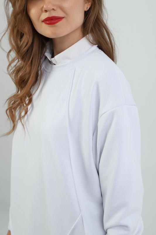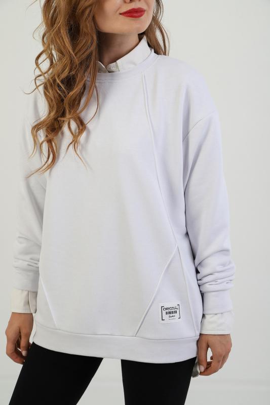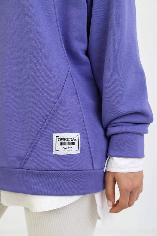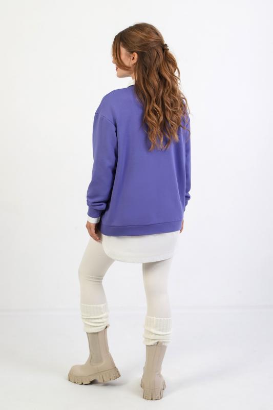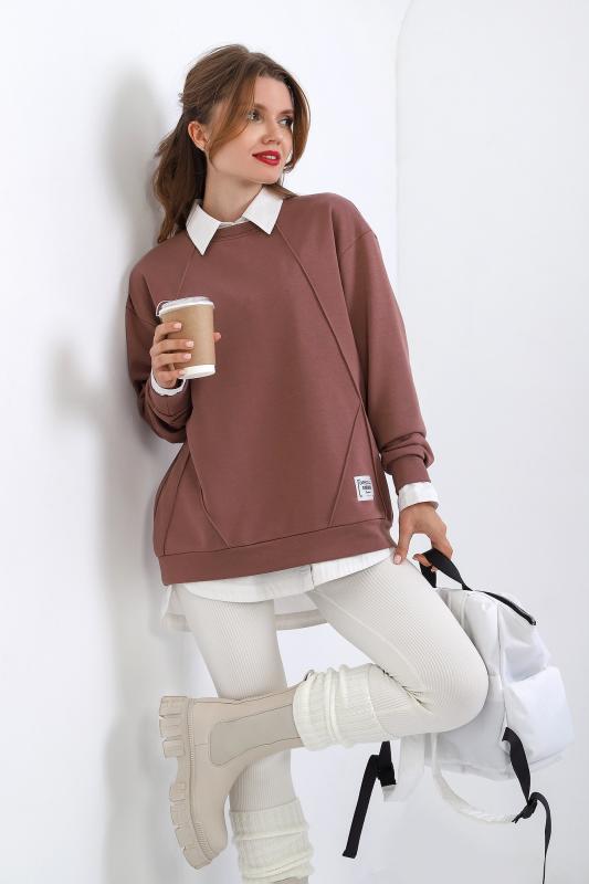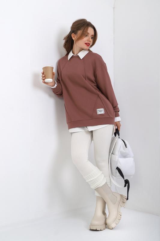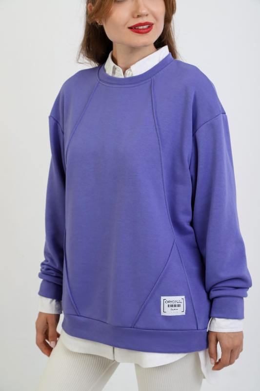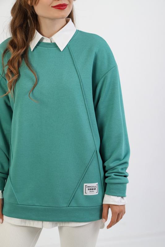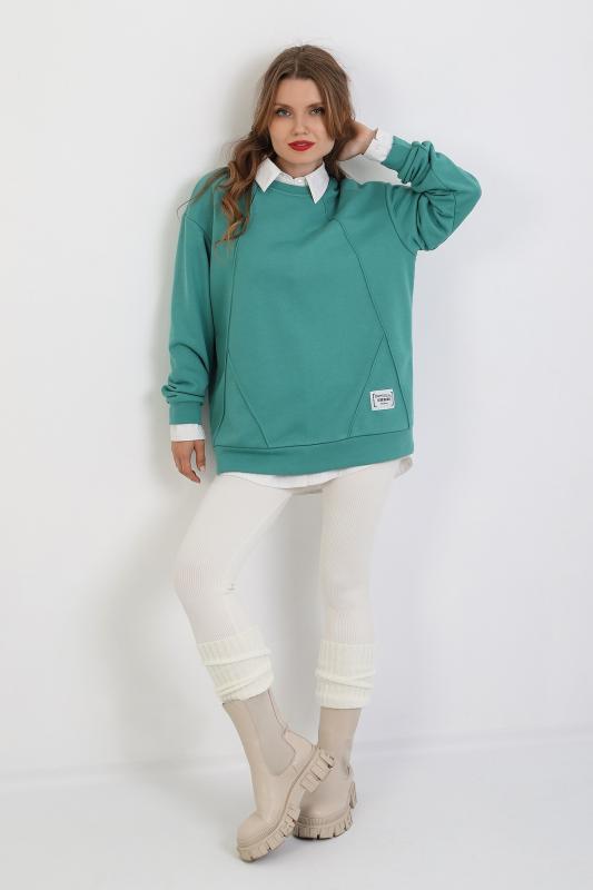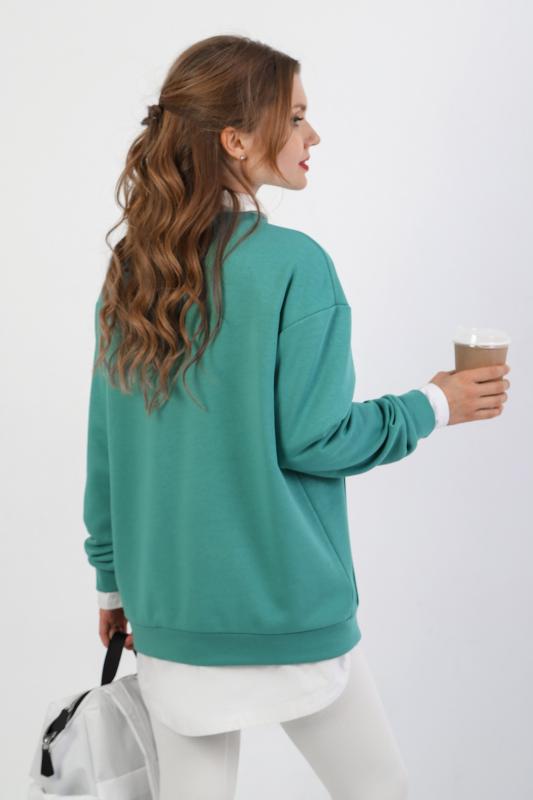 Джемпер молодежный из трикотажного полотна «футер» трехнитка-петля со спущенным плечом, длинными рукавами и горловиной овальной формы, обработанной втачной планкой. На полочке выполнены четыре ассиметричные отделочные строчки. Рукава – с манжетами, низ изделия на притачном поясе, с левой стороны настрочен декоративный элемент.