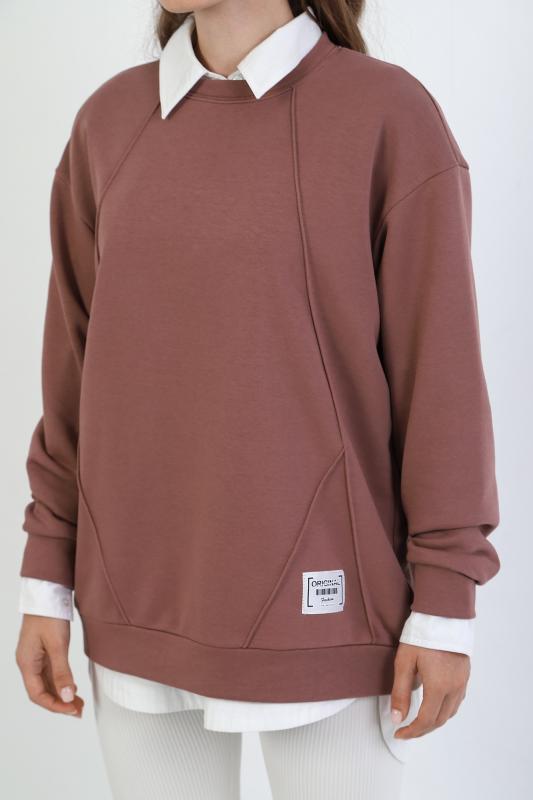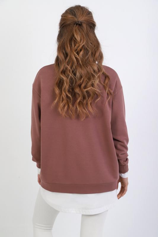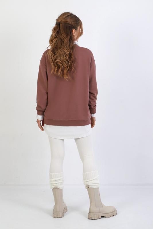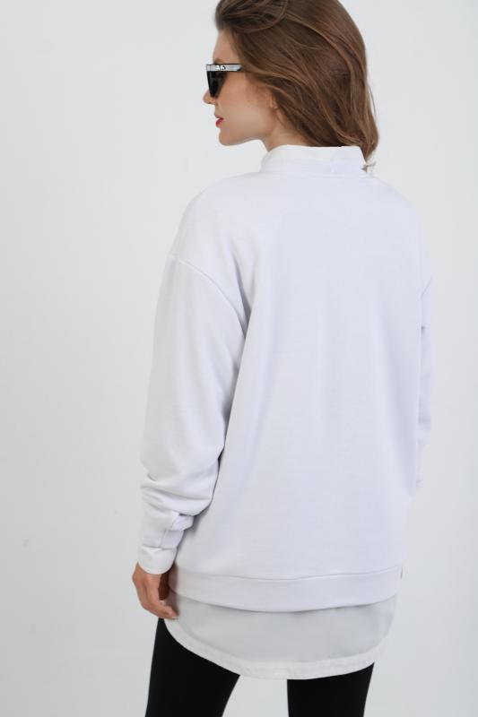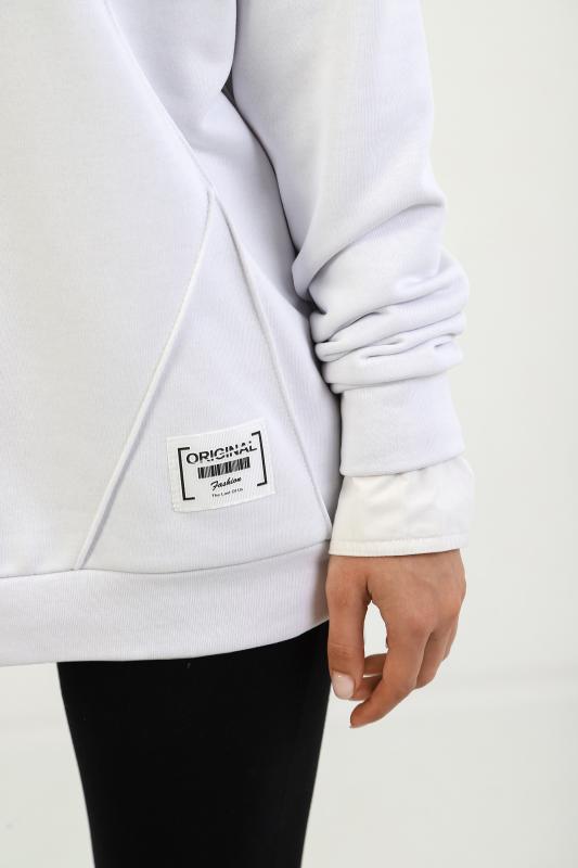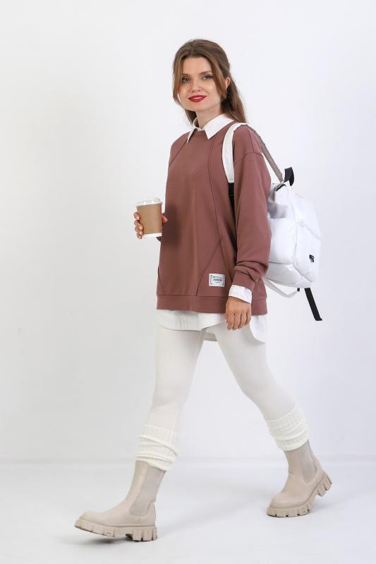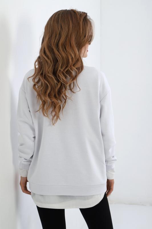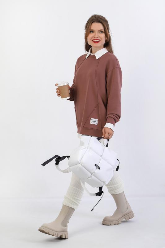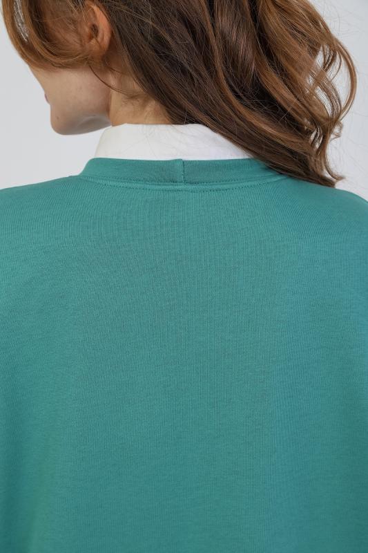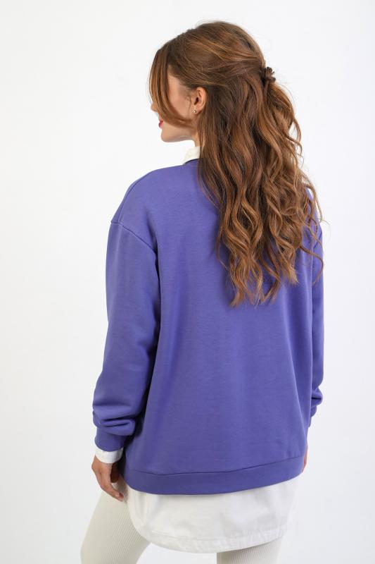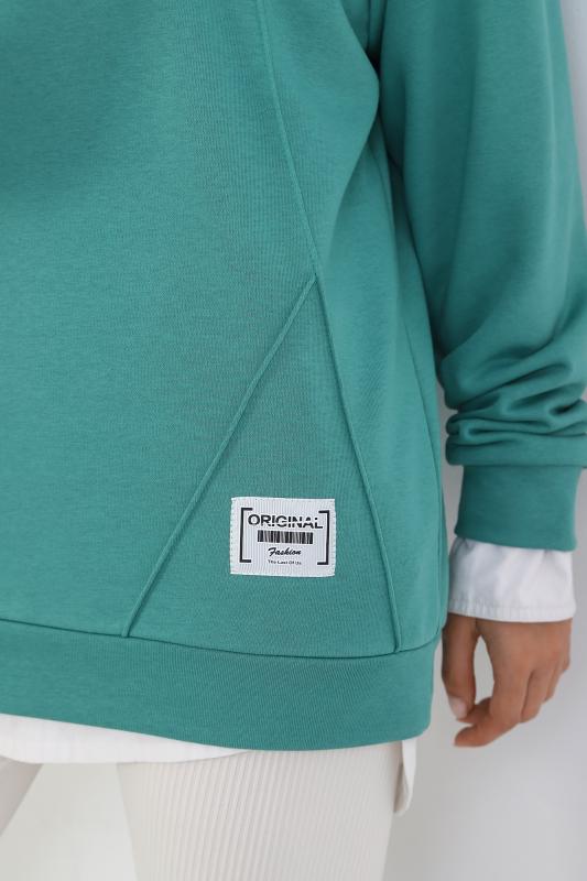 Джемпер молодежный из трикотажного полотна «футер» трехнитка-петля со спущенным плечом, длинными рукавами и горловиной овальной формы, обработанной втачной планкой. На полочке выполнены четыре ассиметричные отделочные строчки. Рукава – с манжетами, низ изделия на притачном поясе, с левой стороны настрочен декоративный элемент.