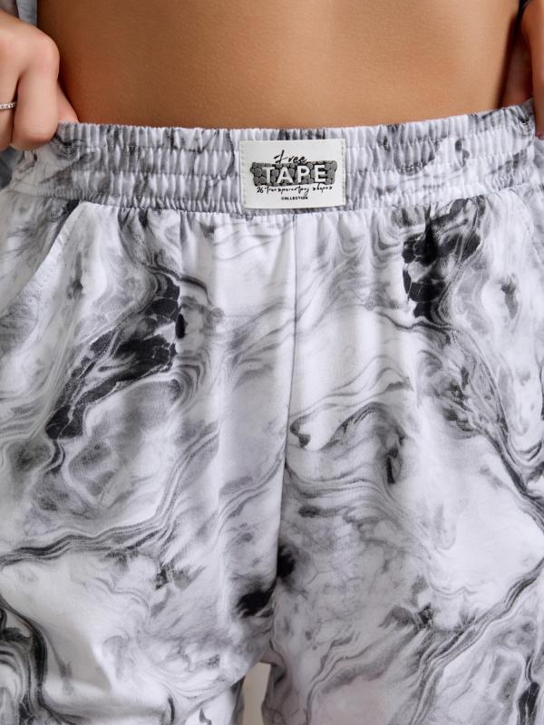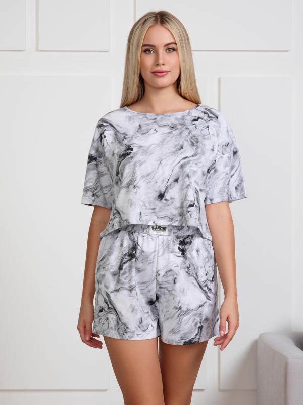 Костюм молодежный из трикотажного полотна «кулирка с набивным. Футболка - укороченная, свободная, с короткими втачными рукавами, горловиной овальной формы, обработанной притачной бейкой из основного материала.Шорты – свободные, укороченные, с карманами в боковых швах, на притачном поясе с эластичной тесьмой внутри. По центру пояса настрочен декоративный элемент-нашивка.