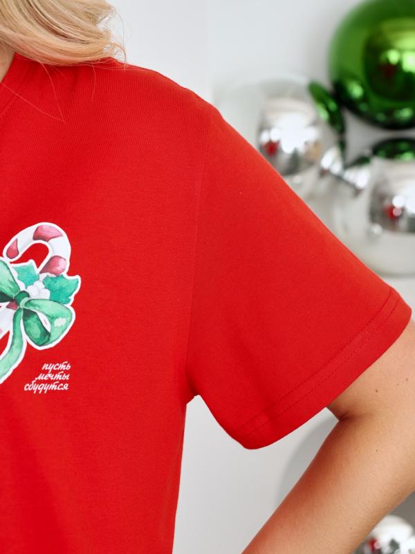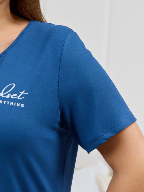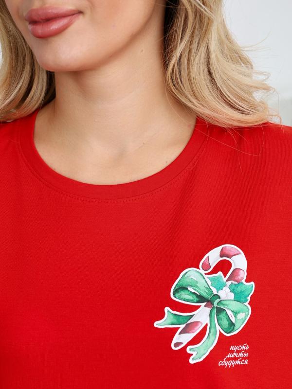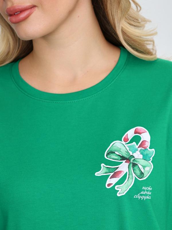 Футболка женская классического покроя: с короткими втачными рукавами, горловиной овальной формы, обработанной втачной планкой, и принтом в центре переда, выполненным в технике шелкографии. По шву втачивания планки в горловину настрочена отделочная строчка на двухигольной машине. неижние срезы рукавов и изделия обработаны подгибкой.