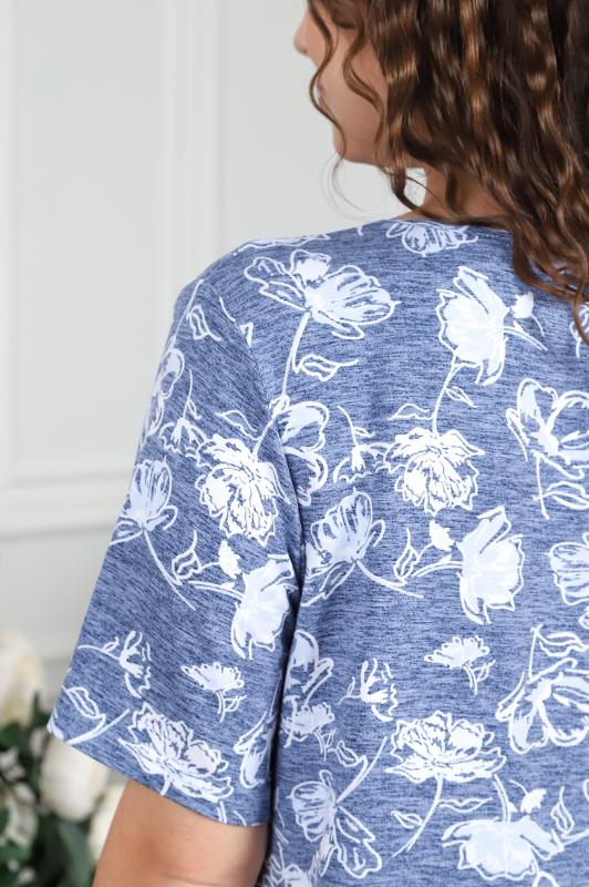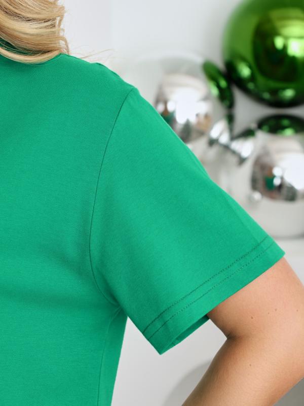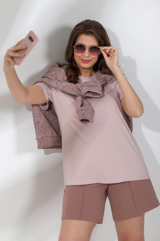 Футболка женская из гладкокрашенного трикотажного полотна «кулирка с лайкрой», свободного покроя, со спущенным плечом и втачными рукавами длиной до локтя, горловиной овальной формы, обработанной втачной планкой, на полочке выполнена вышивка. В нижней части боковых швов – разрезы.