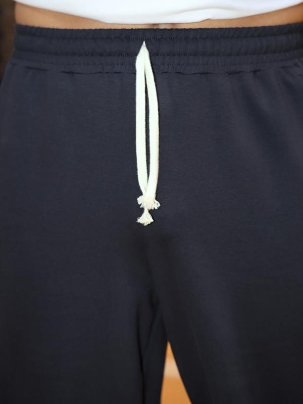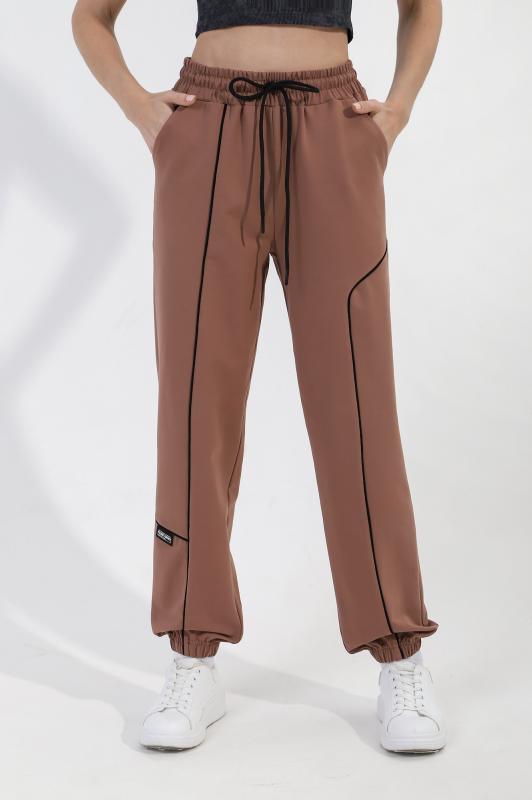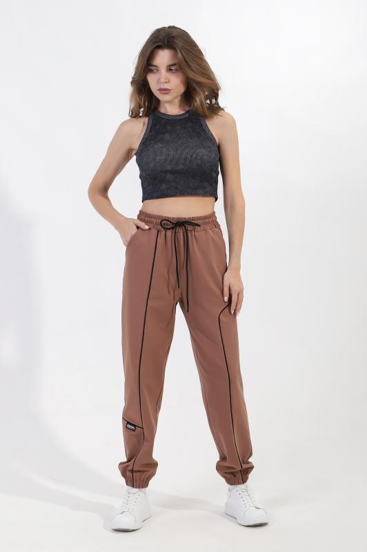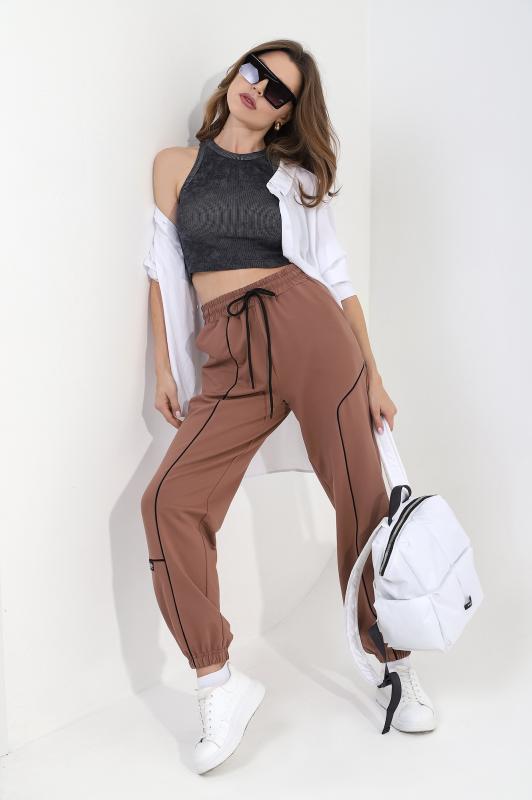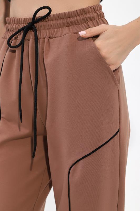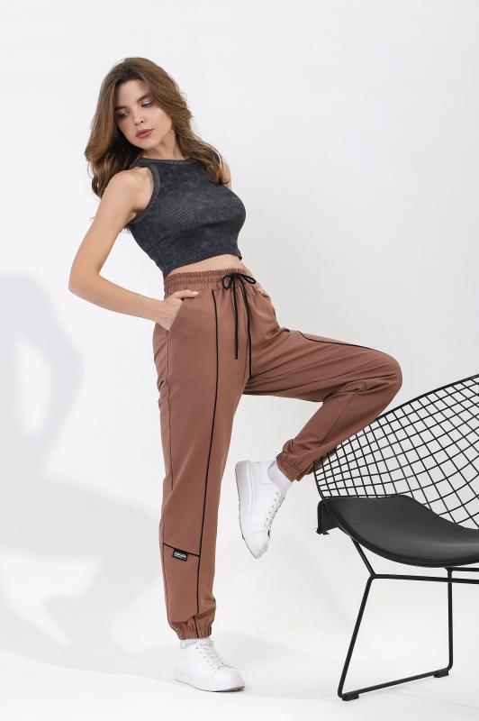 на притачном поясе с эластичной тесьмой внутри, декоративными вставками в боковых швах и карманами, обработанными в соединительных швах передних половин с декоративными вставками. Нижние срезы брюк обработаны с эластичной тесьмой. По швам втачивания вставок и входам в карманы настрочены отделочные строчки. Через петлю пояса продет шнурок, позволяющий регулировать степень прилегания изделия по талии. Примечание: Шнур брюк может отличаться от представленного на фото. Возможные варианты: шнур молочного цвета с темными наконечниками и белый шнур с белыми наконечниками.