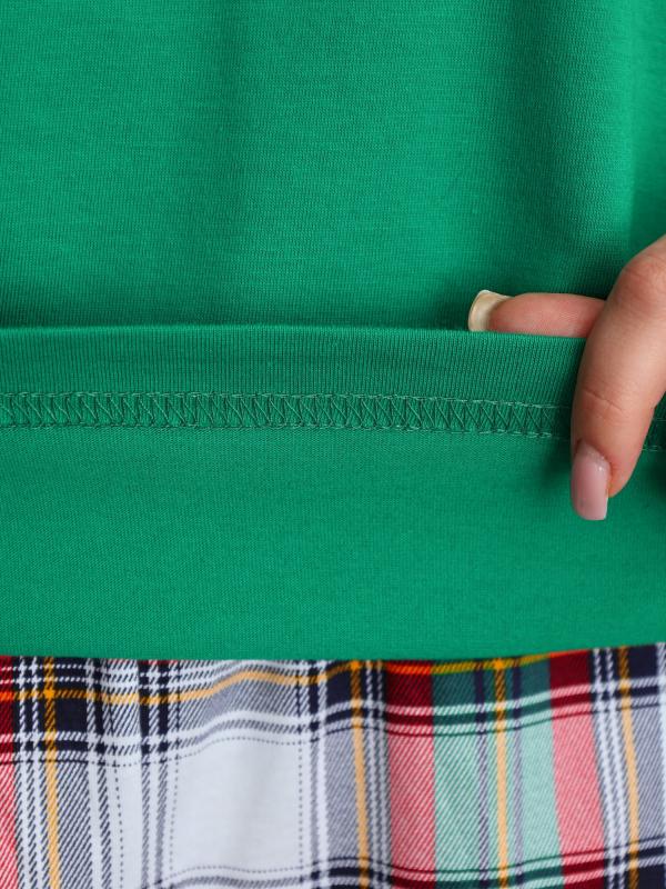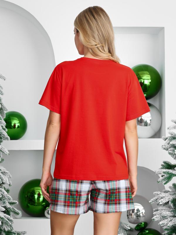 , состоящий из футболки и брюк. Футболка - из гладкокрашеного полотна, модного слегка расширенного силуэта и укороченная по длине, с втачными короткими рукавами, горловиной овальной формы, обработанной втачной планкой и принтом на полочке, выполненным методом шелкографии. Брюки - из полотна в клетку, широкие, прямые, на притачном поясе с эластичной тесьмой внутри и карманами в боковых швах .