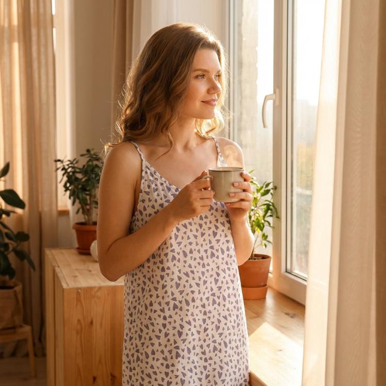 Сорочка молодежная из тканого штапельного полотна с набивным рисунком, свободного покроя, слегка расширенная книзу, на узких бретелях. На полочках – вытачки в области груди. Вырез горловины и проймы окантованы основным материалом. Для регулирования бретелей по длине предусмотрены пластмассовые пряжки и кольца – держатели, устанавливаемые на бретелях.
