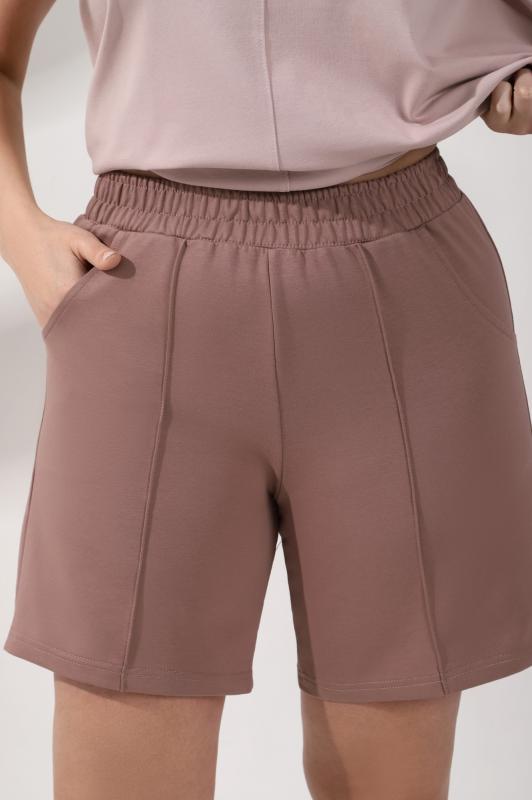 Шорты женские из гладкокрашеного трикотажного полотна «футер-двунитка», удлиненные и расширенные, на притачном поясе с эластичной тесьмой внутри и карманами в боковых швах. Передние половины шорт застрочены по центральным линиям.