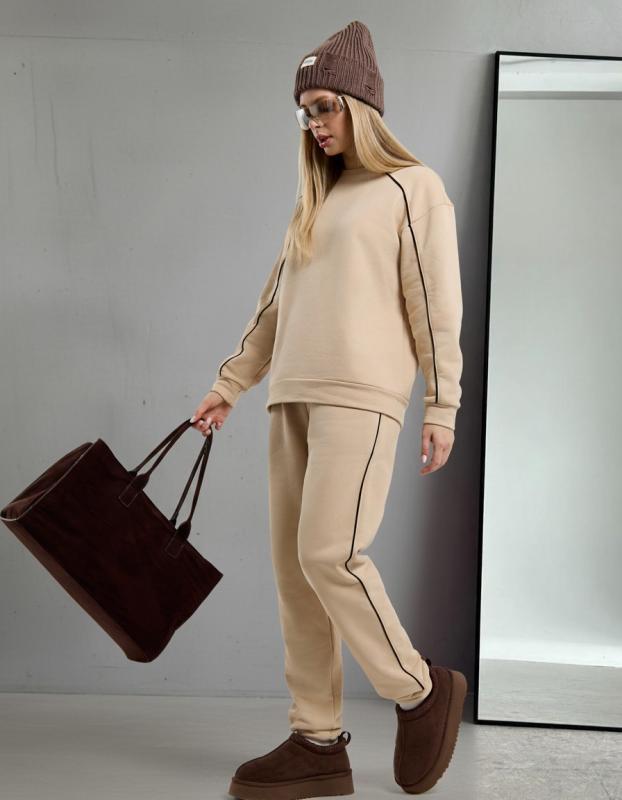 Костюм молодежный из трикотажного полотна футер трехнитка с «эффектом замши», состоящий из джемпера и брюк. Джемпер – прямого силуэта, с длинными втачными рукавами, горловиной овальной формы, обработанной втачной планкой. Рукава с манжетами, низ - с притачным поясом, дополненным декоративным элементом-нашивкой.Брюки – длинные, свободные, на притачном поясе с эластичной тесьмой внутри, карманами в боковых швах.