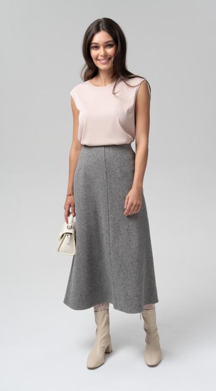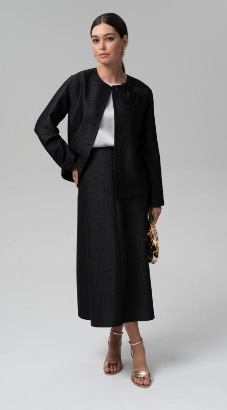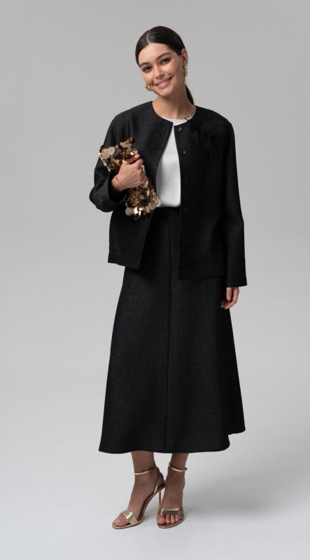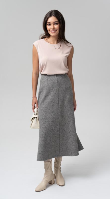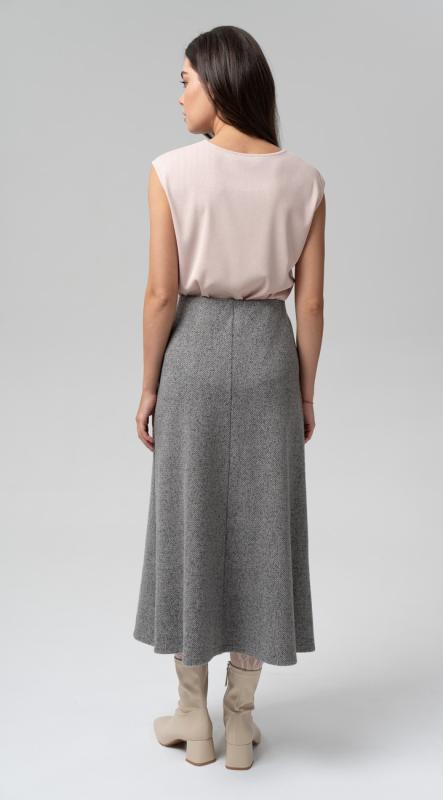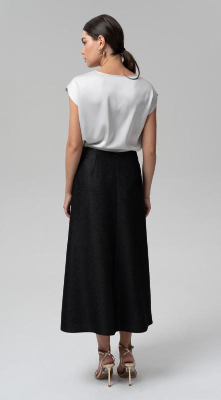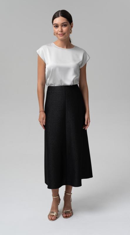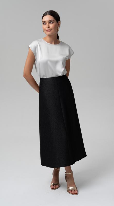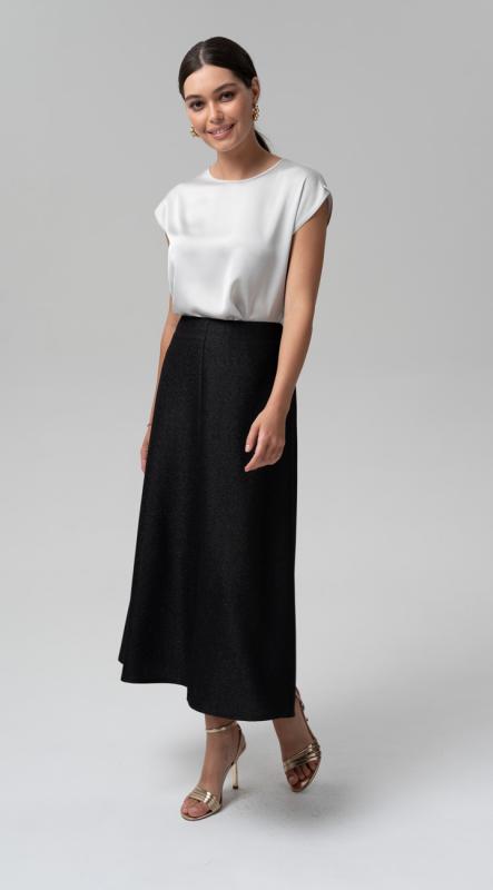 Юбка А-силуэта длиной midi на цельнокроенном поясе с эластичной резиной из костюмной поливискозы с эффектным мерцанием - идеально подойдет для создания вечернего образа. Верхний срез юбки на притачной обтачке. Потайная молния в среднем шве юбки. Юбка на подкладе.