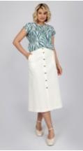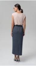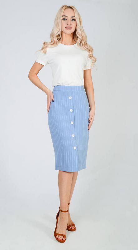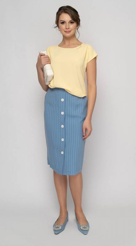 Юбка - карандаш из Tencel® в полоску, слегка зауженная к низу на поясе-кокетке - уже давно стала базой офисного гардероба. Имитация застежки на контрастные пуговицы создает визуально стройнящую вертикаль и позволяет регулировать высоту разреза. Потайная молния в среднем шве юбки.