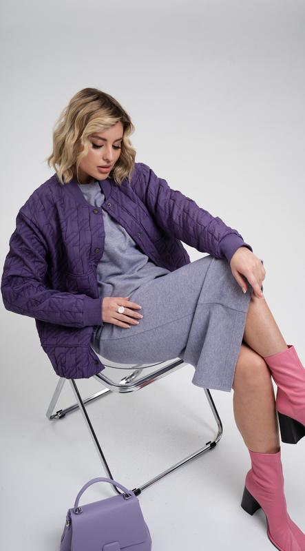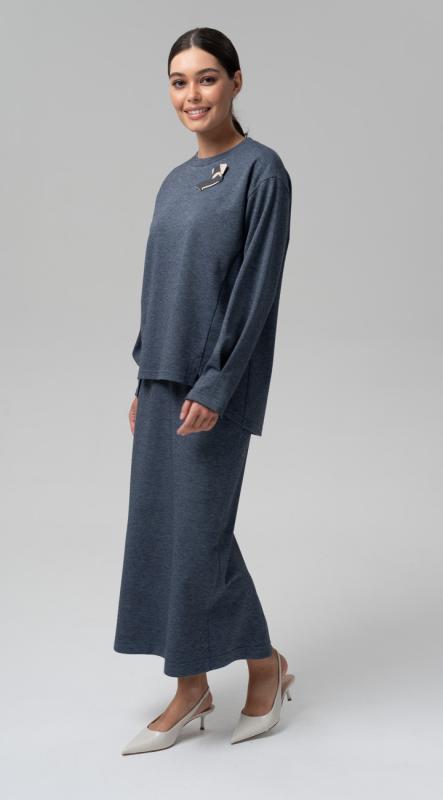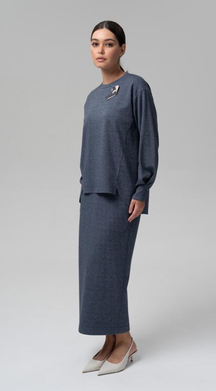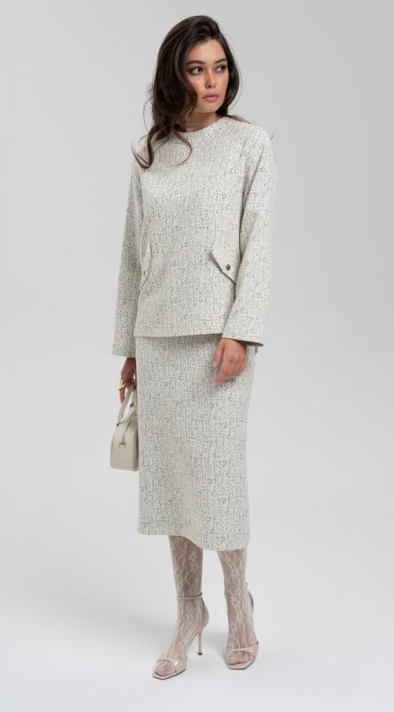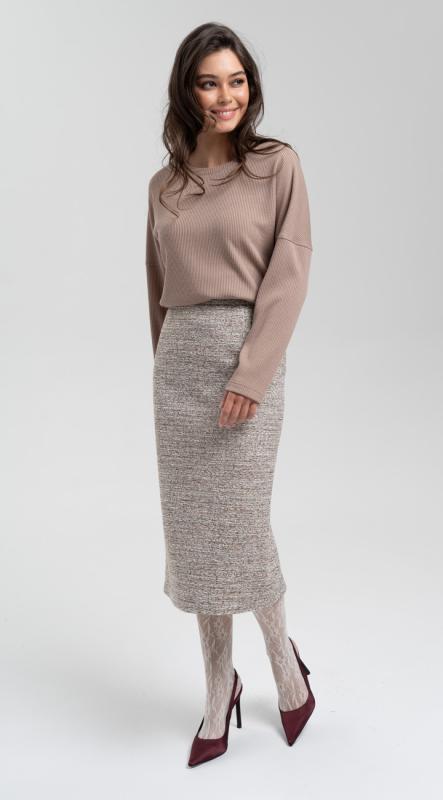 Стильная блуза свободного кроя из фактурного трикотажного полотна – будет органично смотреться как в повседневном образе, так и в офисном, создавая особенное настроение. Рукава полной длины на притачной высокой манжете. Металлизированный кант в швах - визуально удлиняет силуэт, добавляя этой модели сверкающую ноту.