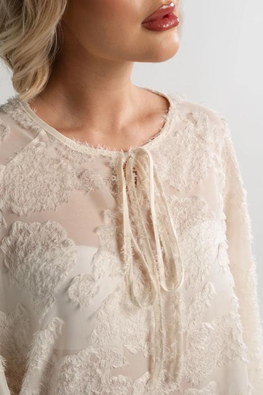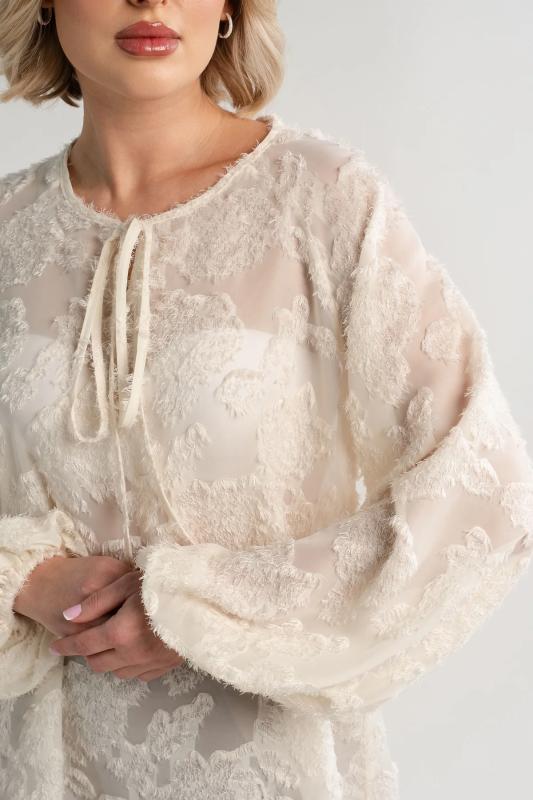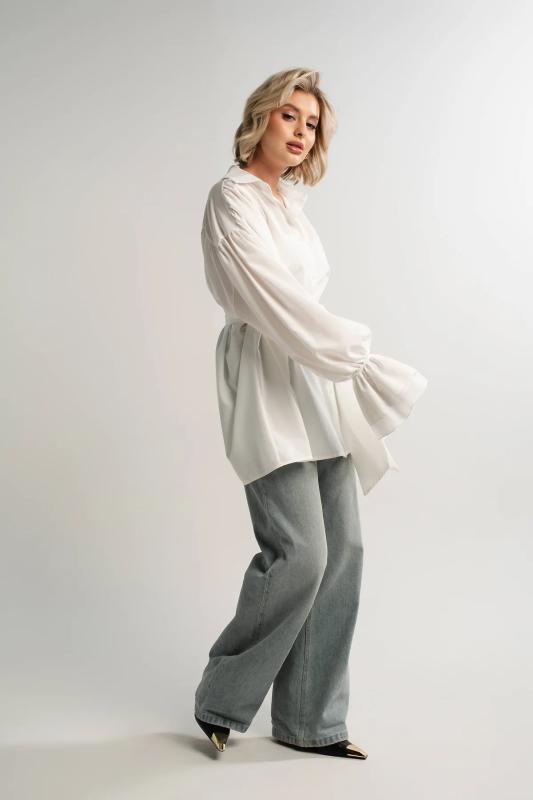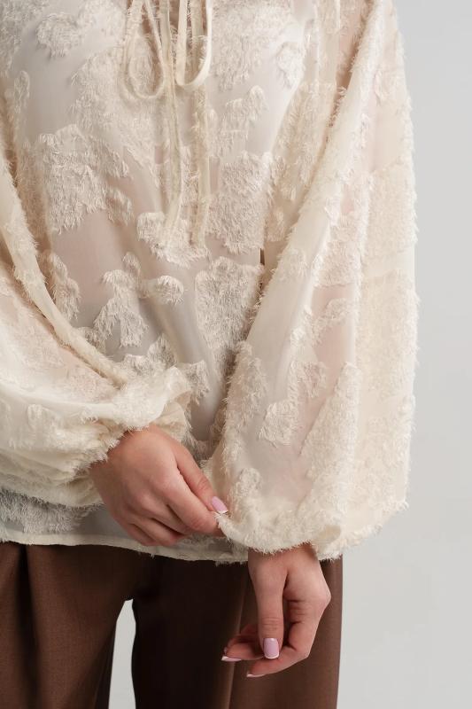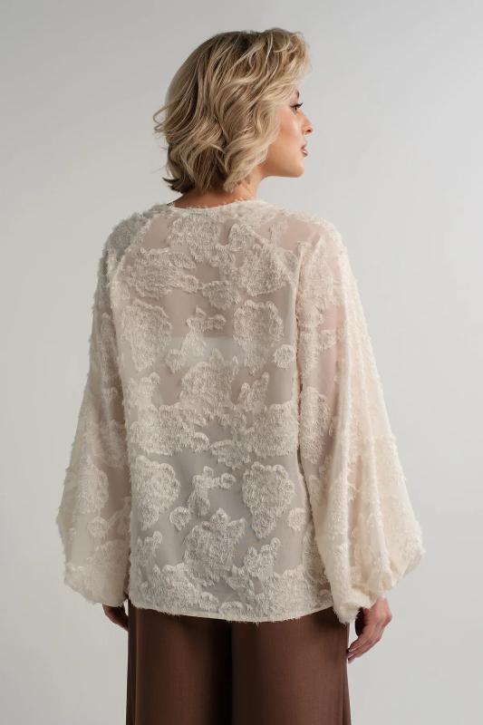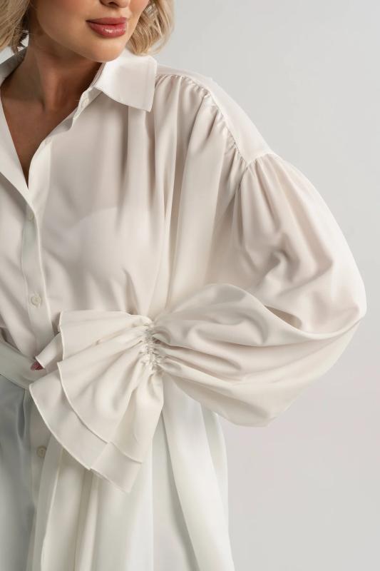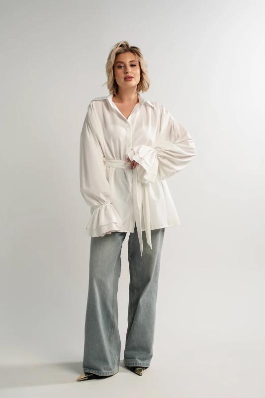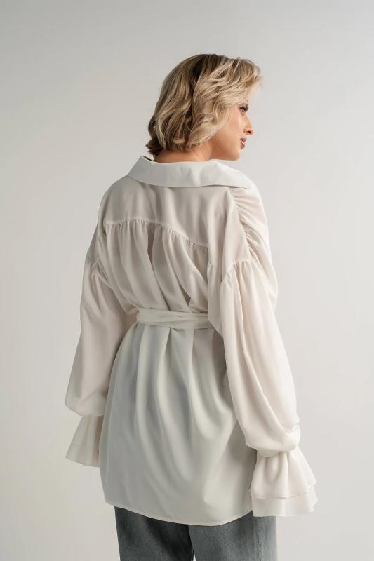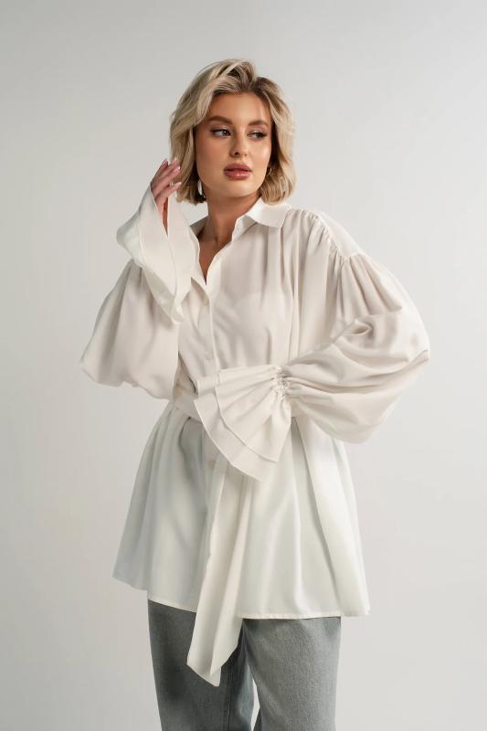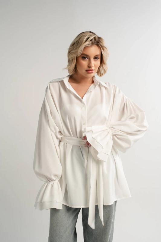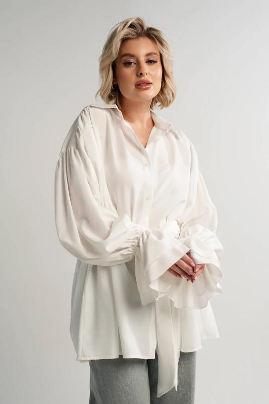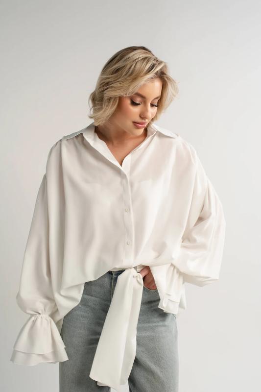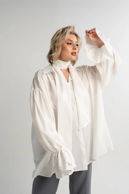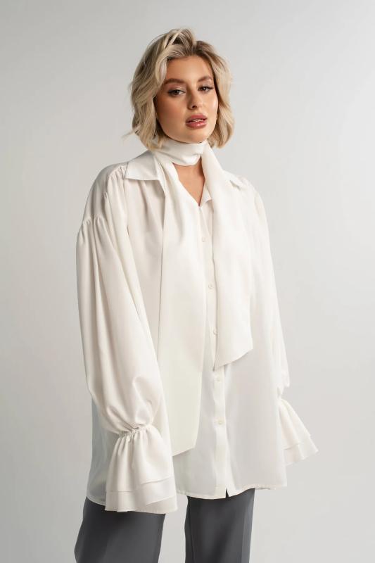 Состав : 95% полиэстер, 5% эластан Материал : блузочный Цвет : молочный Принт : отсутствует Силуэт : свободный Карманы : отсутствуют Подкладка : отсутствует Вид застежки : пуговицы Декоративные элементы : шарф в комплекте Длина : (one size 44-52) - 81 см Обхват груди : (one size 44-52) - 178 Обхват бёдер : (one size 44-52) - 178 Обхват талии : (one size 44-52) - 178 Дополнительные параметры размеров : (one size 44-52) - длина рукава Откройте для себя идеальное сочетание элегантности, комфорта и романтического настроения с нашей женской блузкой, дополненной стильным шарфом. Эта модель, созданная для того, чтобы подчеркнуть вашу женственность, обеспечивает свободу движений и дарит ощущение легкости и изящества. Особенностью блузки являются рукава с воланами, которые придают ей очарование и воздушность. В комплекте с блузкой идет стильный шарф, который можно носить по-разному: завязать на шее как галстук или накинуть на плечи, чтобы придать образу загадочность и изысканность. Сочетайте эту блузку с юбкой-каранд