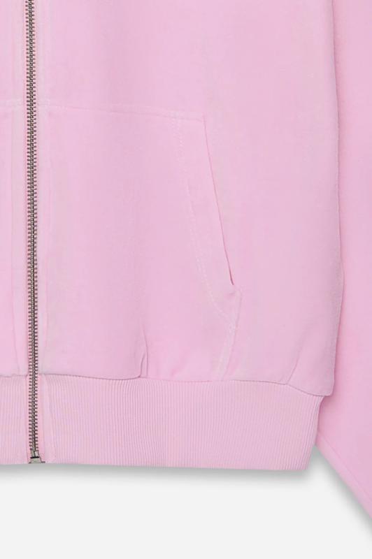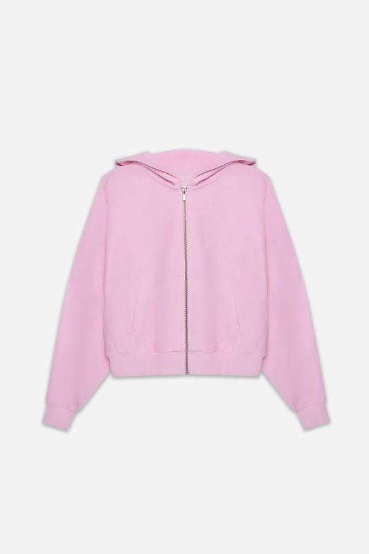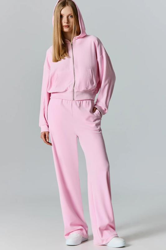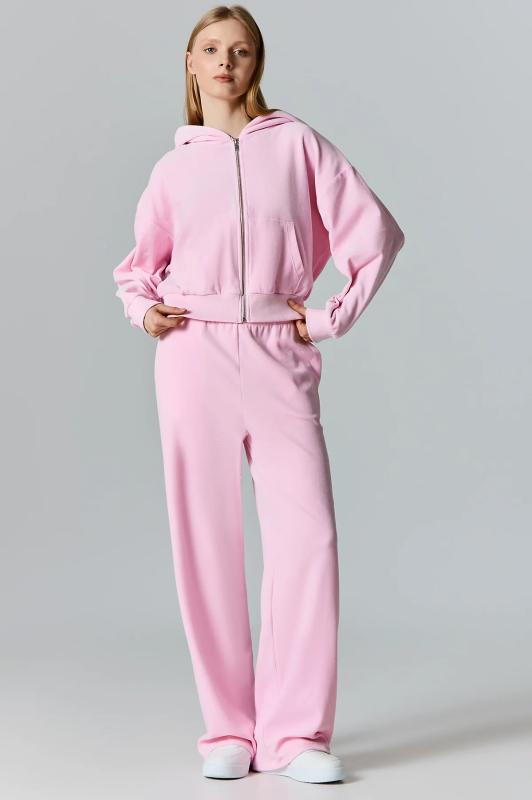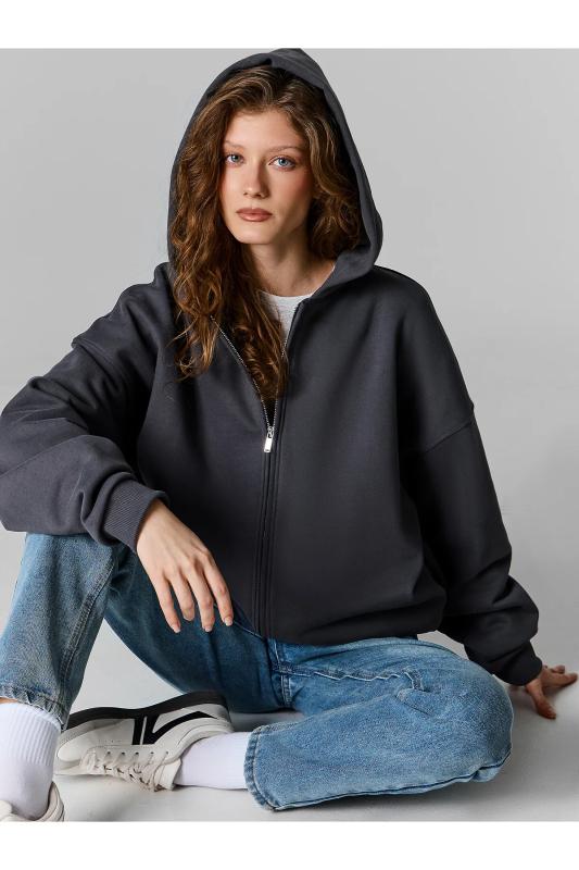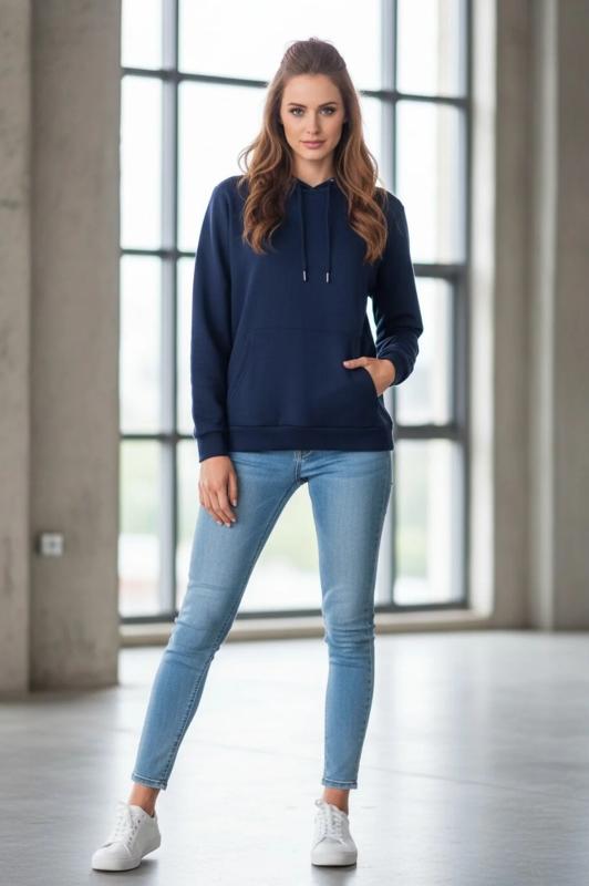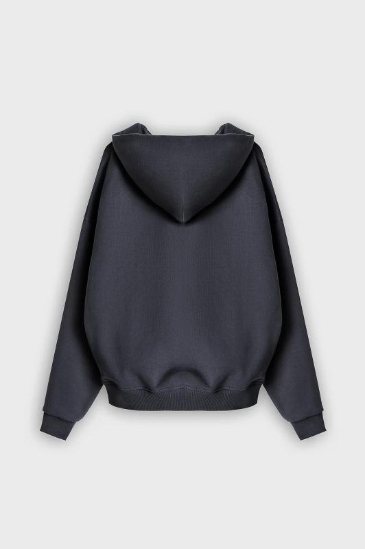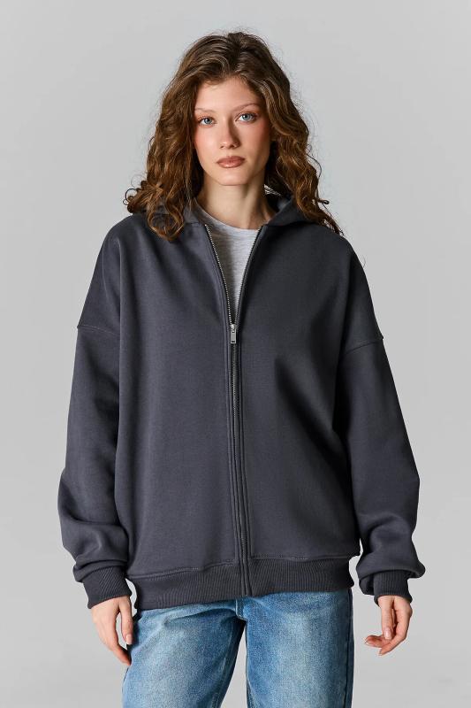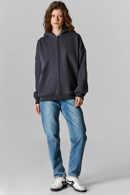 Толстовка женская свободного силуэта. Перед и спинка цельнокроеные. Рукава длинные, втачные. По переду центральная застежка на металлическую молнию и накладные карманы. Горловина обработана капюшоном. По низу рукавов манжеты, пояс и манжеты из рибаны.