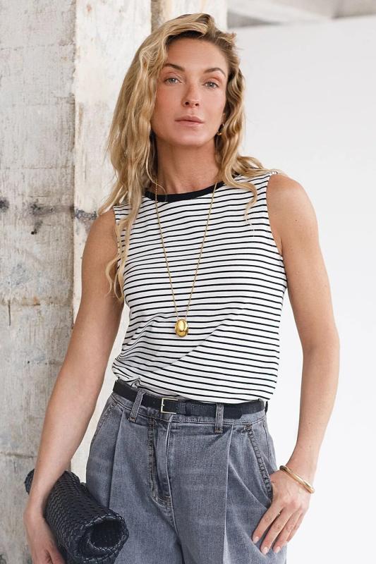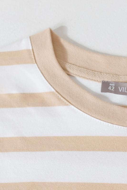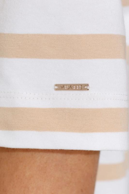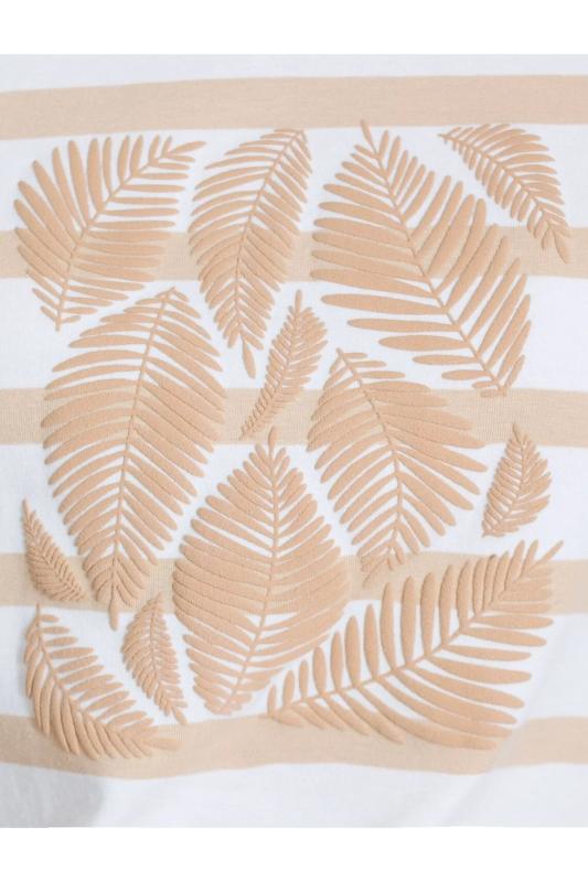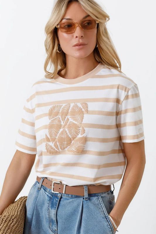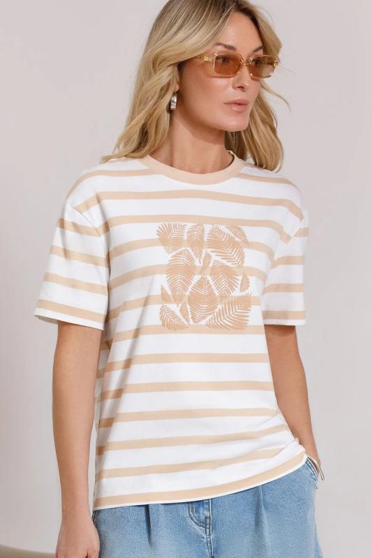 Модная футболка белого цвета в горизонтальную бежевую полоску привлекает внимание своим интересным дизайном и ярким принтом. Благодаря прямому крою изделие комфортно садится на любую фигуру, в том числе на большие размеры, и не сковывает движений. Круглый вырез подчеркивает современный стиль, а натуральный материал плотностью 170 Г-м2 из хлопка с добавлением эластана обеспечивает удобство в повседневной носке и приятные тактильные ощущения. Прочность и износостойкая структура позволяют сохранять свежий внешний вид после множества стирок. Принт в виде листиков нанесен красками с устойчивым покрытием. Стильная футболка гармонично вписывается в любой гардероб и подойдет для прогулок, отдыха или неформальных встреч. Благодаря особенностям кроя модель хорошо сидит, скрывая недостатки и подчеркивая достоинства. Яркая футболка идеально сочетается с базовыми вещами, позволяя создавать новые интересные образы каждый день.