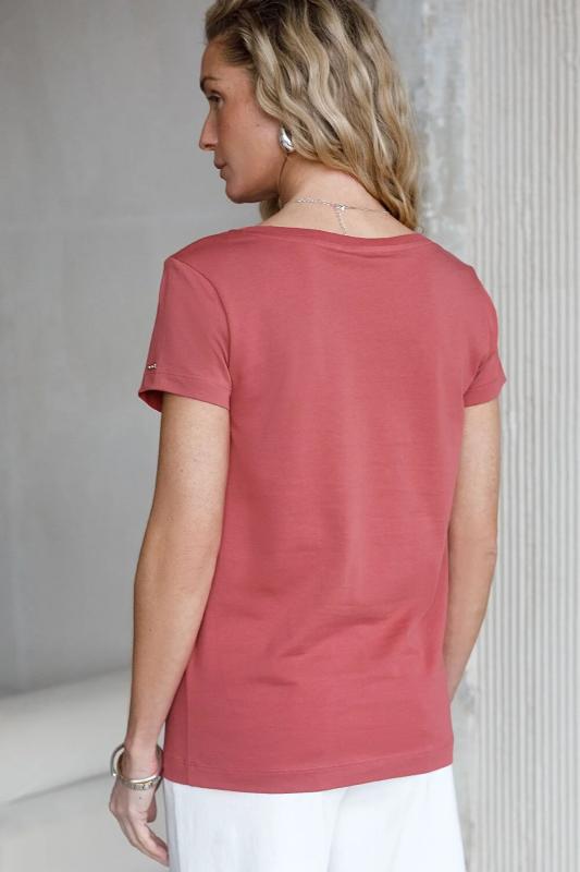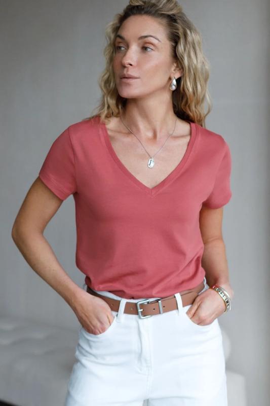 Базовая футболка темно-кораллового цвета с V-образным вырезом выполнена из премиального хлопка плотностью 170 Г-м2. Добавление эластана в состав изделия способствует формоустойчивости. Футболка выполнена из качественного натурального материала, отлично сидит по фигуре и подходит для отдыха и работы. Преимущество этой модели - V-образный вырез, который подчеркивает линию шеи и придает внешнему виду элегантность. Такой фасон гармонично вписывается как в классические, так и в современные гардеробы. Декольте делает изделие более женственным и визуально вытягивает силуэт, создавая ощущение легкости. Такая футболка средней длины и классического кроя идеально подойдет под любую одежду. Модель доступна в больших размерах, чтобы каждая женщина могла подчеркнуть свою индивидуальность.