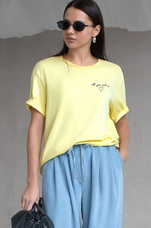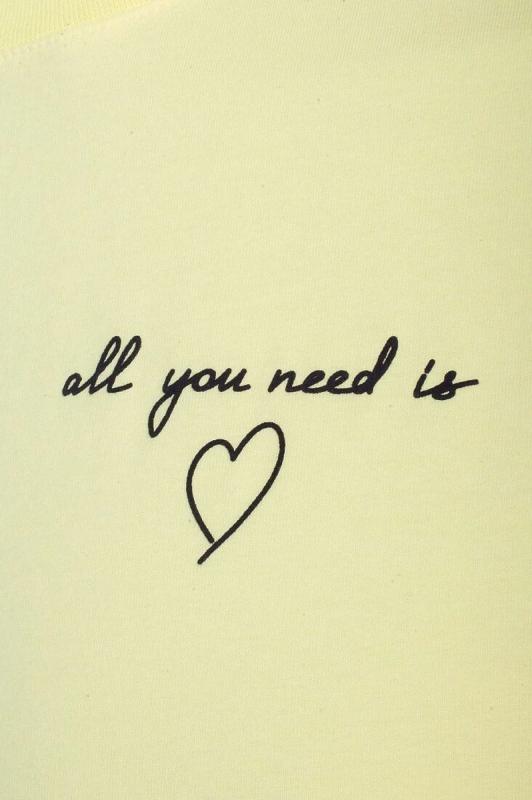 Модная футболка лимонного цвета привлекает внимание своим интересным дизайном и ярким принтом. Благодаря прямому крою изделие комфортно садится на любую фигуру, в том числе на большие размеры, и не сковывает движений. Круглый вырез подчеркивает современный стиль, а натуральный материал из хлопка с добавлением эластана обеспечивает удобство в повседневной носке и приятные тактильные ощущения. Прочность и износостойкая структура позволяют сохранять свежий внешний вид после множества стирок. Принт в виде надписи и сердца нанесен красками с устойчивым покрытием, перевод надписи: Al you need is love- Все, что вам нужно это любовь. Стильная футболка гармонично вписывается в любой гардероб и подойдет для прогулок, отдыха или неформальных встреч. Благодаря особенностям кроя модель хорошо сидит, скрывая недостатки и подчеркивая достоинства. Яркая футболка идеально сочетается с базовыми вещами, позволяя создавать новые интересные образы каждый день.
