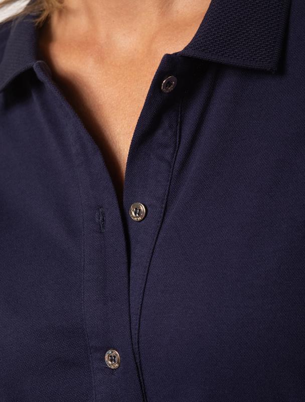 Поло выполнено из фактурного хлопка, которое обеспечивает комфорт даже в жаркое время года и почти не мнется. Контрастная планка застегивается на матовые серебряные пуговицы с логотипом бренда. Преимущество изделия — это добавление эластана в классический для поло материал «пике», что гарантирует безупречный комфорт и долговечность. Поло сочетается в паре со светлым денимом и чиносами, в офис с черными брюками.