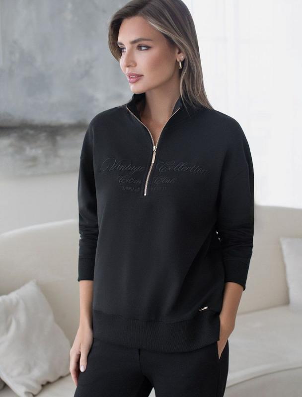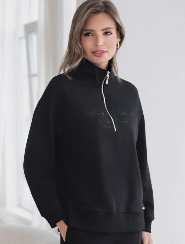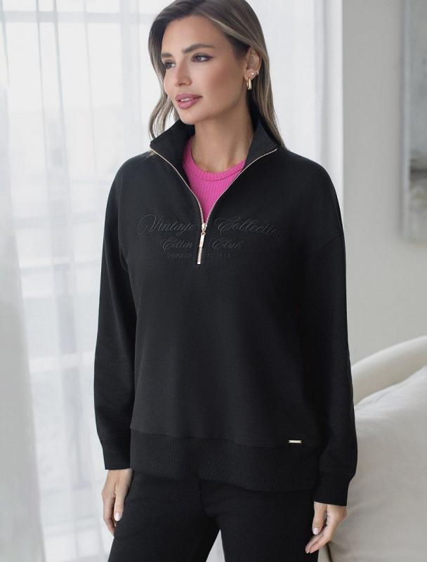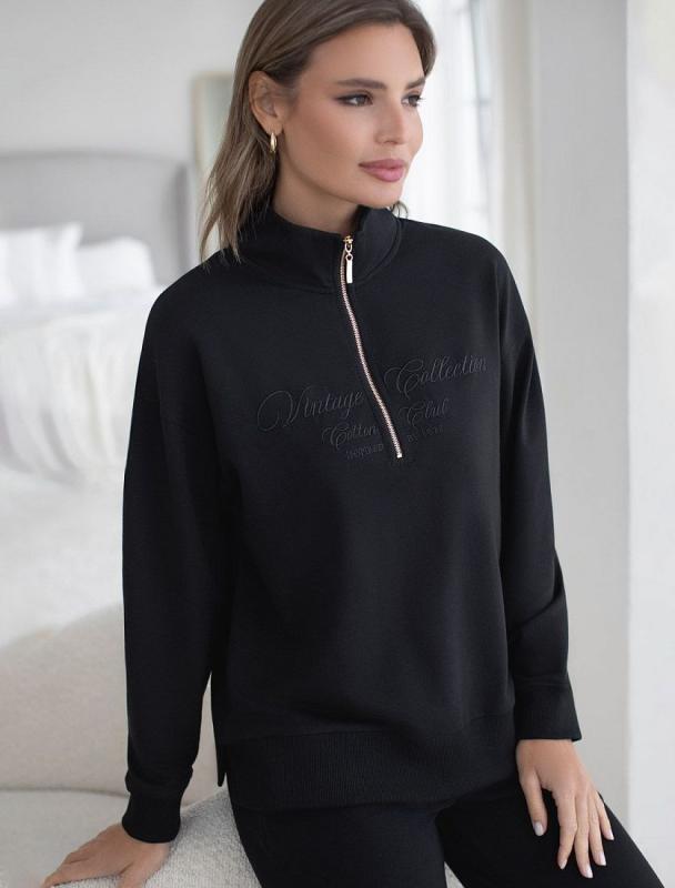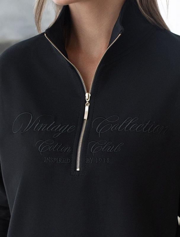 Уютный и комфортный вариант для прохладной погоды – стильный джемпер черного цвета с воротом на молнии. Изготовлен из премиального футера двухнитки с добавлением эластана. Материал сохраняет форму при длительном ношении и после многократных стирок, его мягкая текстура дарит ощущение уюта и тепла. Минималистичная вышивка в тон изделия в виде надписи. перевод надписи: Vinlage collection cotton club - Винтажная коллекция Хлопковый клуб. Свободный крой джемпера позволяет не ограничивать движения, что особенно важно для активного образа жизни. Подойдет на любую женскую фигуру, представлена широкая размерная линейка, большие размеры, легко комбинируется с другими вещами, создавая модные образы в стиле спорт-шик. Этот повседневный джемпер сочетает в себе удобство и актуальность, будет универсальным выбором для отдыха или прогулок.
