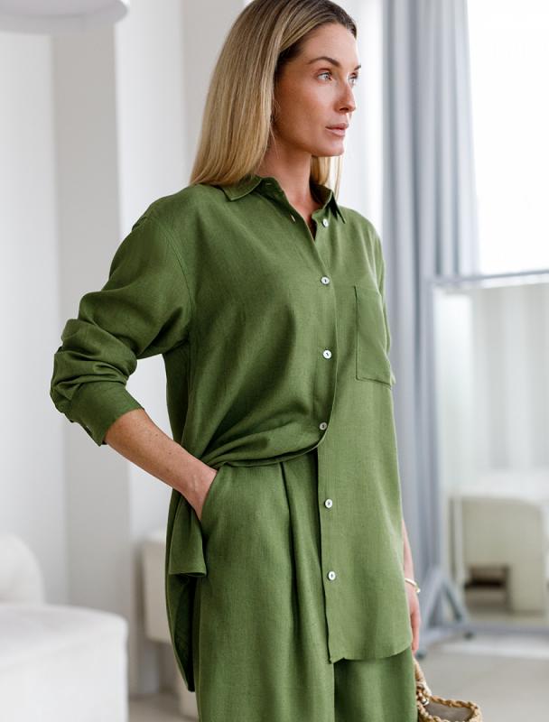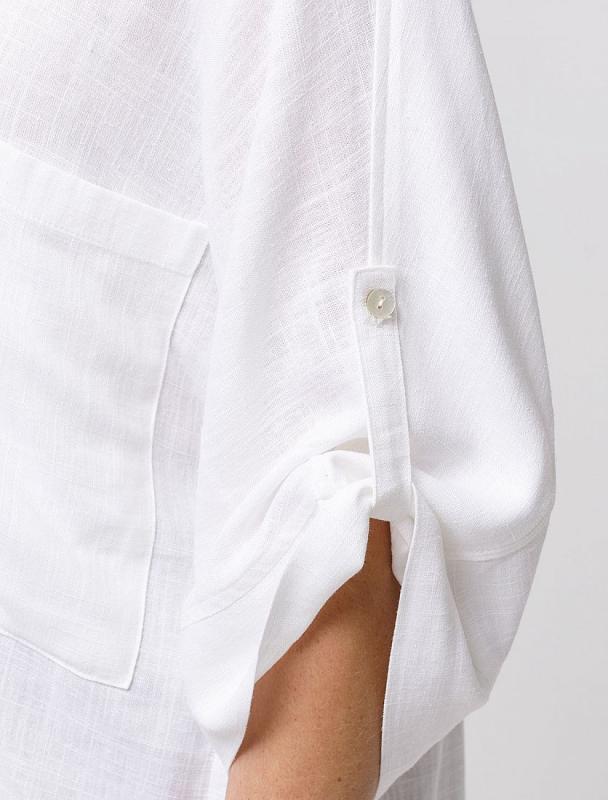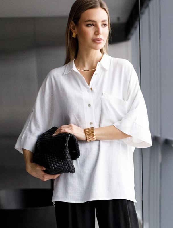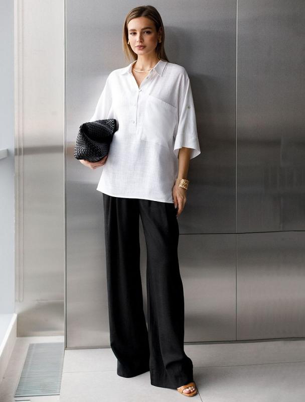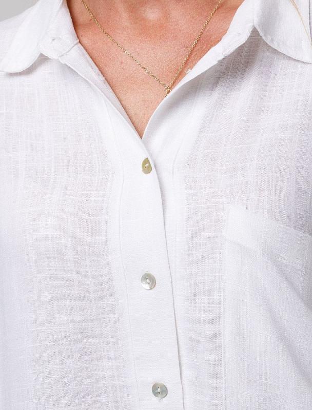 Блузка выполнена изо льна с вискозой. Модель с застежкой на пуговицы из натурального перламутра дополнена сольным карманом. Сочетается в костюме с брюками D24.222 и шортами D28.052. Ткань изящно струится, почти не мнется и сохраняет форму в течении долгого времени, обладает высокой воздухопроницаемостью, обеспечивая комфорт даже в самое жаркое время года.
