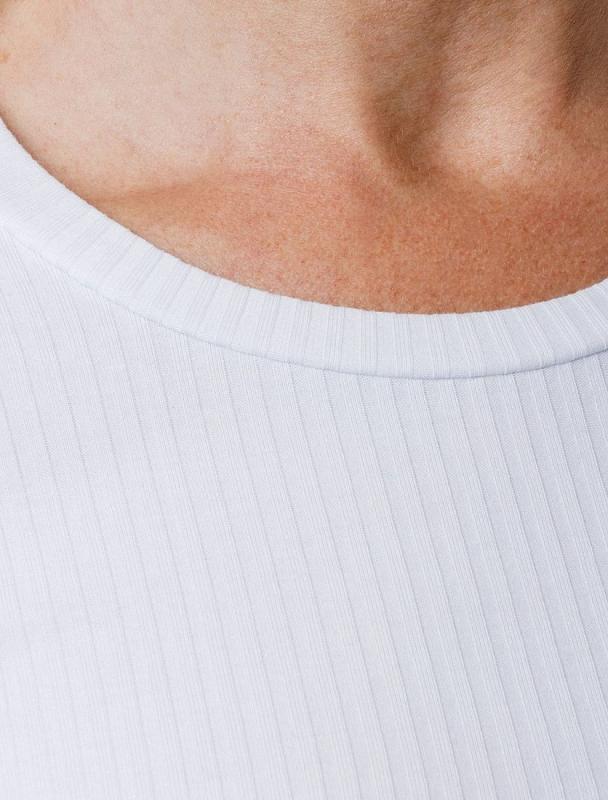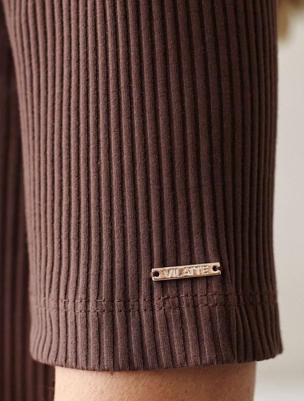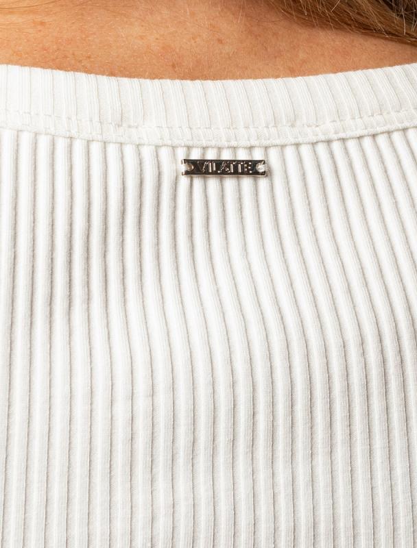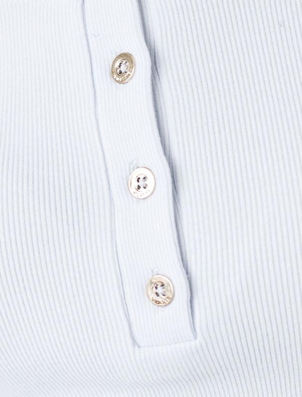 Футболка выполнена из трикотажа в широкий рубчик. Модель с квадратным вырезом дополнена декоративными пуговицами. Эластичный хлопковый трикотаж сидит по фигуре, не сковывает движений и очень комфортный в носке. Фактура вертикальных полос визуально стройнит и вытягивает силуэт. Базовое изделие хорошо впишется в любой гардероб. Идеально подходит для многослойных образов.