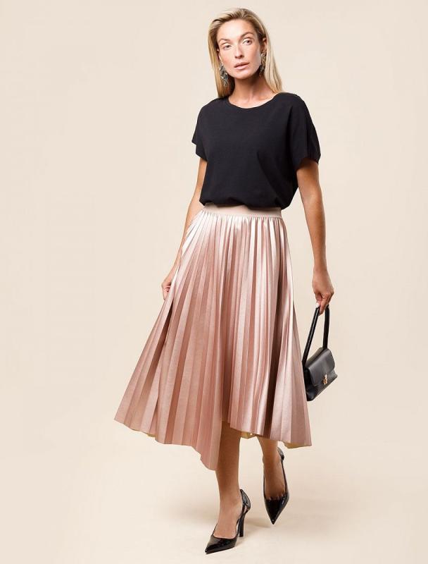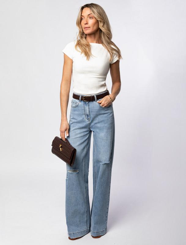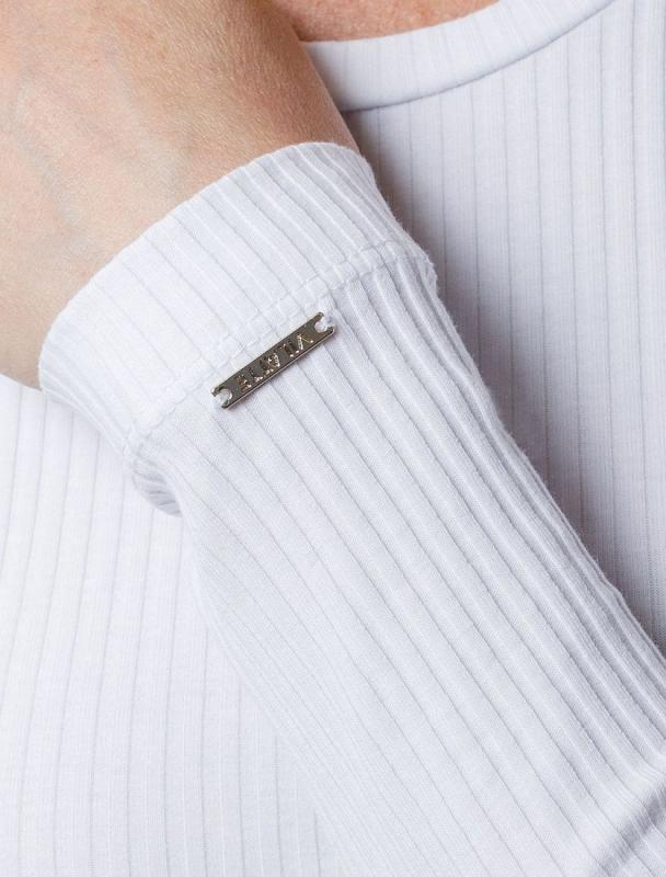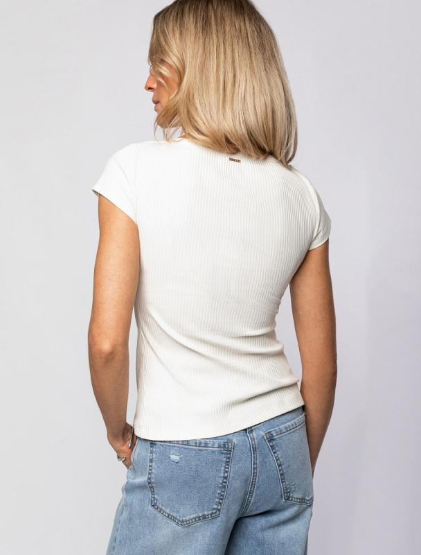 Футболка выполнена из фактурного трикотажа в широкий рубчик. Модель с трендовым коротким рукавом и горловиной формы лодочка. Эластичный материал безупречно сидит по фигуре не сковывая движений. Впишется в любой гардероб. Изделие дополнено металлическим логотипом бренда.