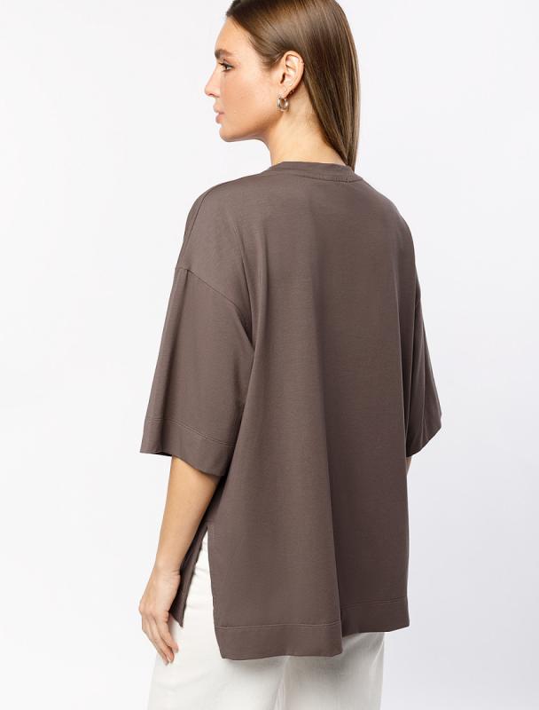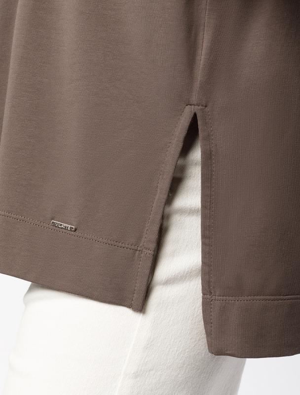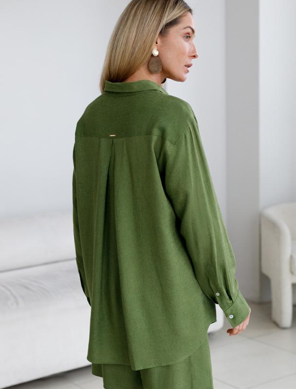 Удлиненная блузка свободного кроя выполнена из премиальной вискозы и лиоцелла. Застежка на пуговицы из натурального перламутра. Приятная на ощупь ткань охлаждает кожу в жаркую погоду. Отлично впишется в нестрогий офисный дресс-код или в расслабленном повседневном образе с джинсами и юбками. На спинке фирменный логотип бренда.