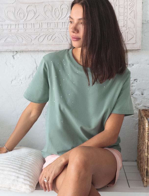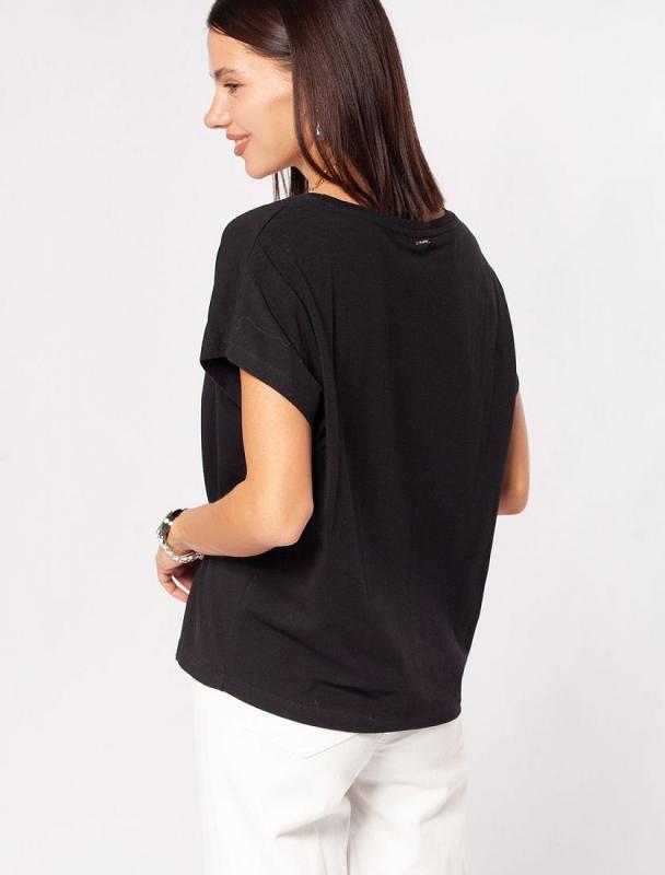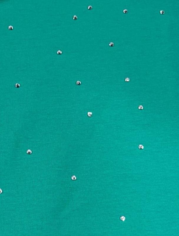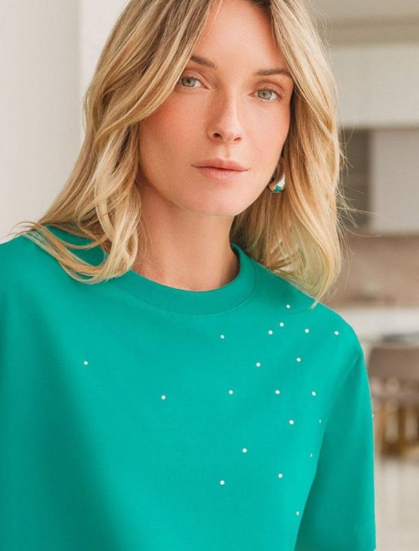Футболка выполнена из премиального хлопка с эластаном. Модель украшена россыпью сияющих стразов, которые будут сверкать и переливаться под лучами солнца или на вечеринке. Футболка отлично держит форму, почти не мнется и комфортно сидит по фигуре. Отдельным украшением служит металлический логотип бренда.