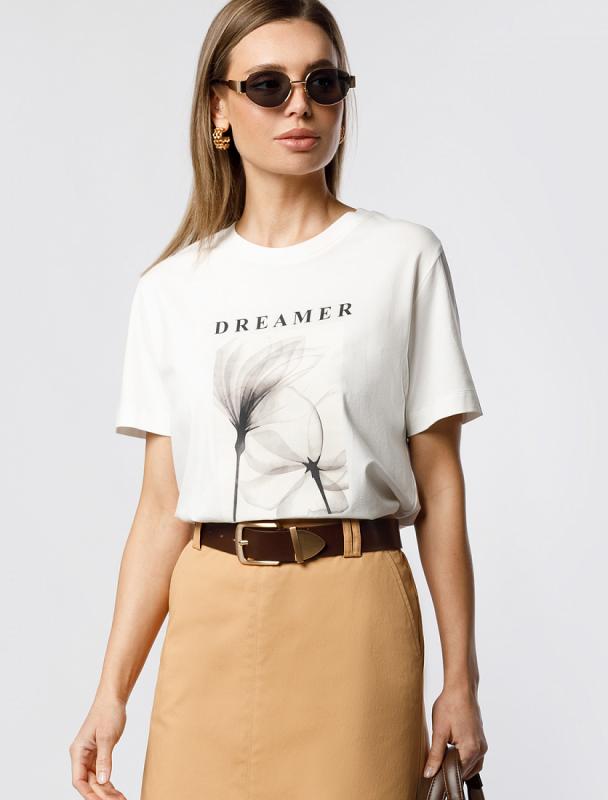 Футболка выполнена из премиального хлопка. Авторский принт нанесен красками с устойчивым покрытием. Перевод: «Dreamer - a person who lives in her own magical world - Мечтатель — человек, который живет в своем волшебном мире» Наличие эластана в составе гарантирует абсолютный комфорт и долговечность изделия. Базовая модель впишется в любой гардероб. Дополнительным украшением служит металлическим логотипом бренда.