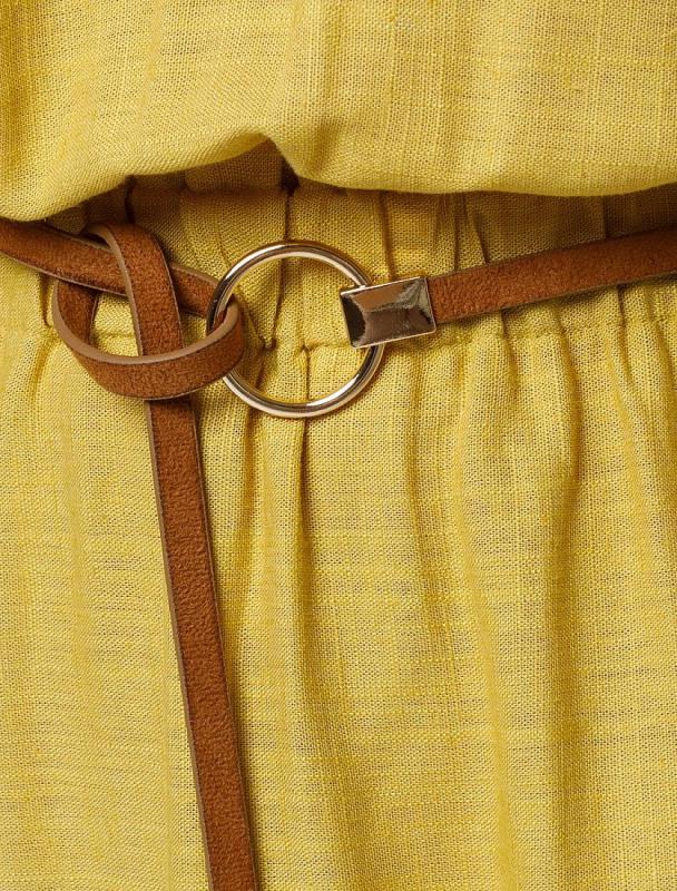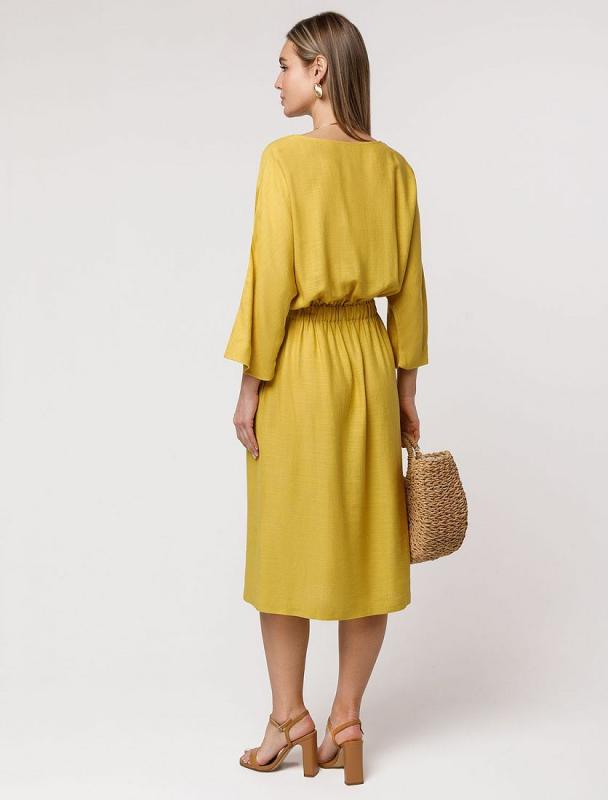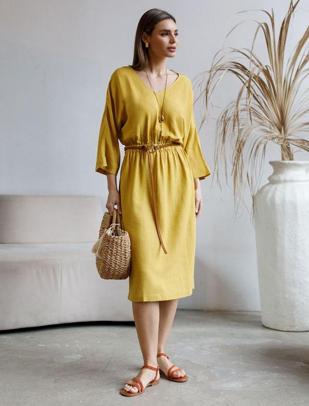 Платье выполнено изо льна с вискозой. Модель с V-вырезом и с цельнокроеным рукавом в стиле кимоно дополнено вшитым поясом из эластичной резинки. В комплект входит ремешок из эко-замши с золотистым кольцом. По бокам два кармана. Лён в составе обеспечивает прочность и воздухопроницаемость, вискоза эластичность и гладкость ткани. Благодаря такому сочетанию изделие хорошо драпируется, меньше мнется и сохраняет форму в течении долгого времени.