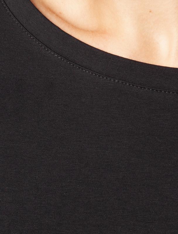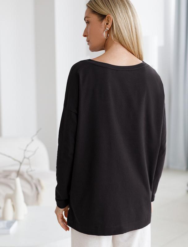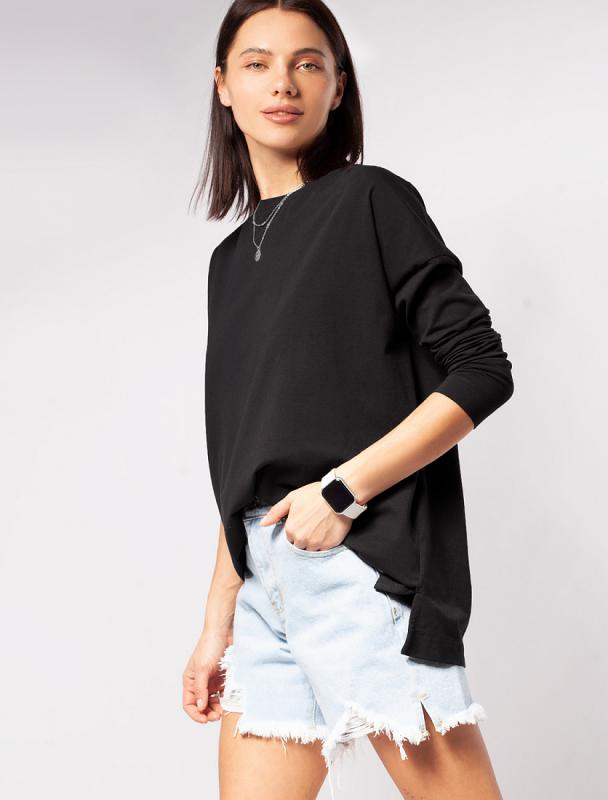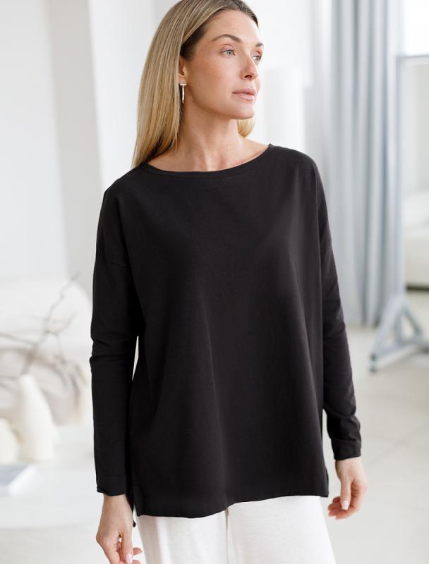Свободный базовый джемпер черного цвета с длинными рукавами и круглым вырезом сшит из премиального хлопка. Однотонная хлопковая модель хорошо поддерживает комфортный для тела микроклимат. Благодаря вплетению эластановых волокон вещь хорошо сохраняет форму. Подходит для любого типа фигуры.