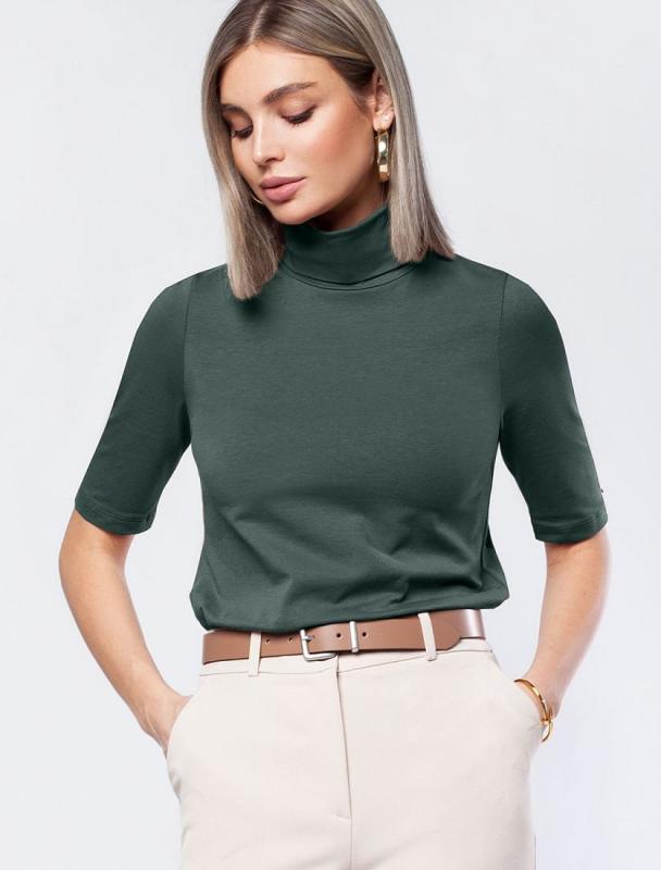 Темно-оливковая водолазка с коротким рукавом выполнена из премиального хлопка с добавлением эластичных волокон. Гладкий трикотаж обеспечит гарантированный комфорт и удобство в использовании. На рукаве изделия металлическая нашивка с логотипом бренда. Совет стилиста: водолазку с коротким удобно сочетать с жакетом или блузкой. Также как самостоятельный верх к широким брюкам.