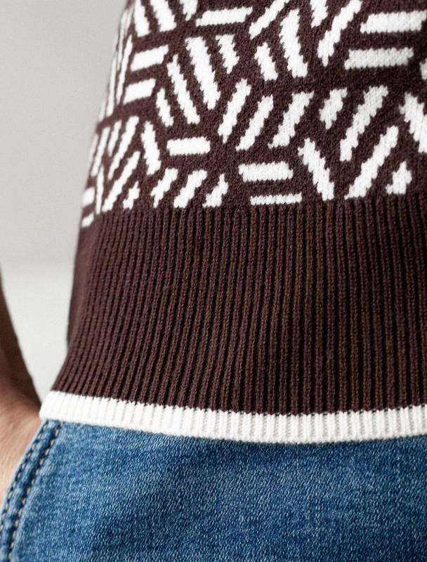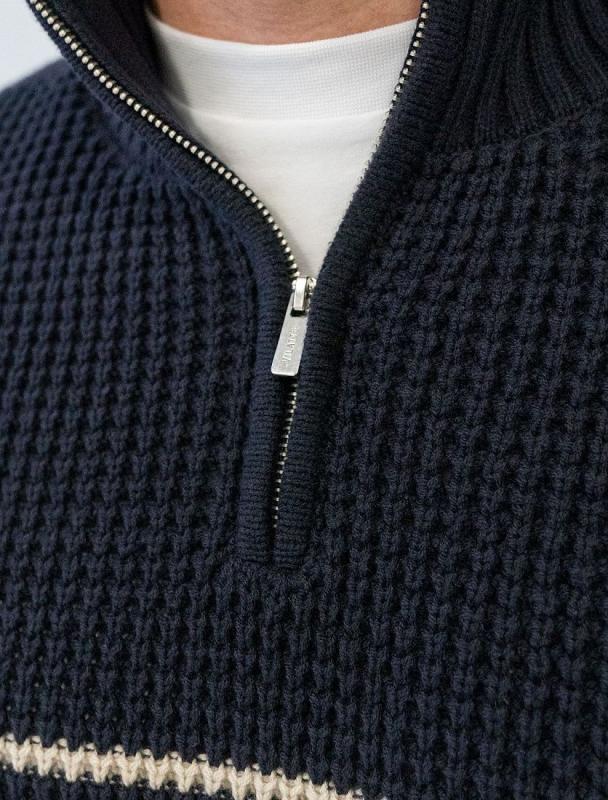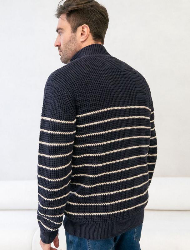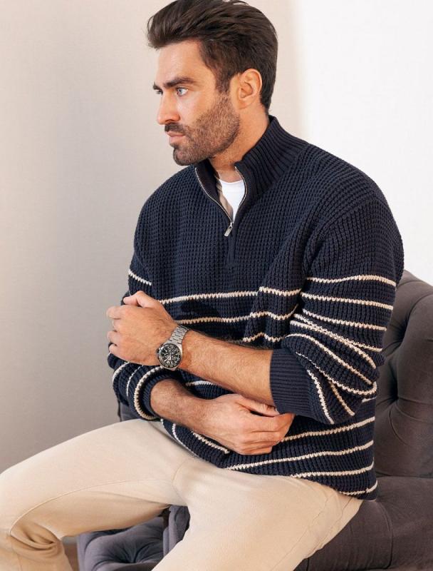 Свитер с узором полосы выполнен из хлопковой пряжи с добавлением акрила. Теплая модель фактурной крупной вязки с воротом, застегивается металлической молнией. Регулируя ворот можно носить с рубашками, футболками и водолазками. Кроме того, свитер совершенно не колется, поэтому его комфортно носить даже на голое тело. Внизу изделия нашивка бренда из эко-кожи.