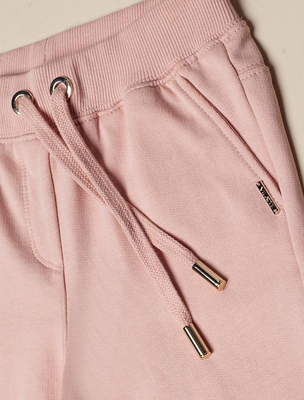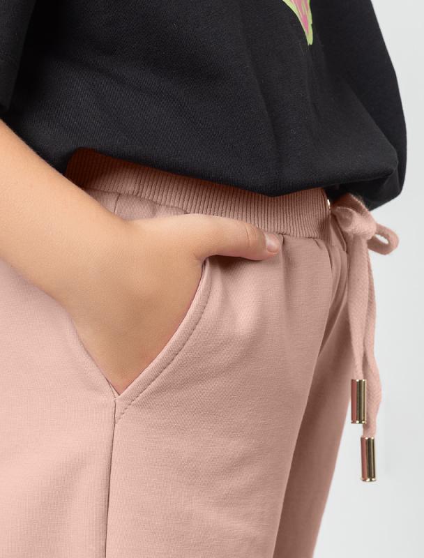 Пудровые джоггеры сшили из мягкого хлопкового трикотажа. Премиальный футер из 100% хлопка позволяет воздуху циркулировать и не раздражает кожу, а свободный крой модели не сковывает движения. За удобную посадку на талии отвечает широкий эластичный пояс с регулируемым шнурком. Модель дополнена высококачественной фурнитурой золотистого цвета. Идеально в костюме с худи F49.405