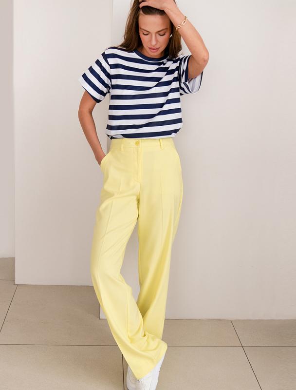 Брюки выполнены из плотного джерси. Модель со стрелками из трикотажа хорошая альтернатива классическим брюкам из костюмной ткани. Эластичный материал не сковывает движений и очень формоустойчив. Для большего удобства пояс дополнен резинкой сзади. Сочетается с любым верхом, в зависимости от выбранной обуви, можно создавать деловой стиль или более расслабленный, повседневный.