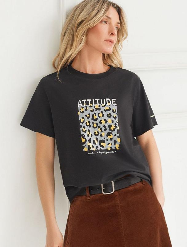 Перевод принта: Attitude makes a big difference - от отношения зависит многое. Футболка выполнена из премиального хлопка. Авторский принт нанесен фактурными красками с устойчивым покрытием. Наличие эластана в составе гарантирует комфорт и формоустойчивость. Изделие дополнено фирменным металлическим логотипом бренда.