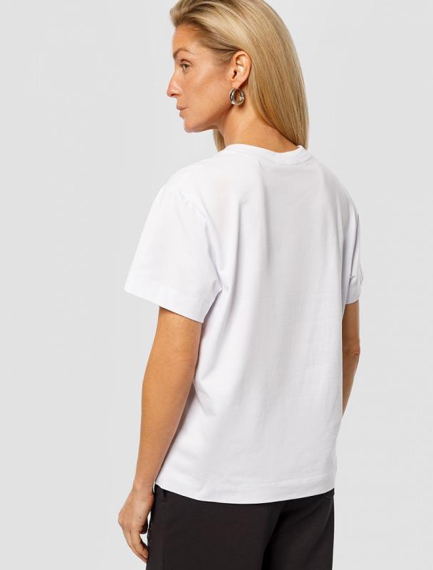 Свободная футболка выполнена из премиального хлопка. Авторский принт выполнен фольгой с устойчивым покрытием. Добавление эластана в состав изделия гарантирует безупречный комфорт и долговечность. Модель украшена металлическим логотипом бренда.