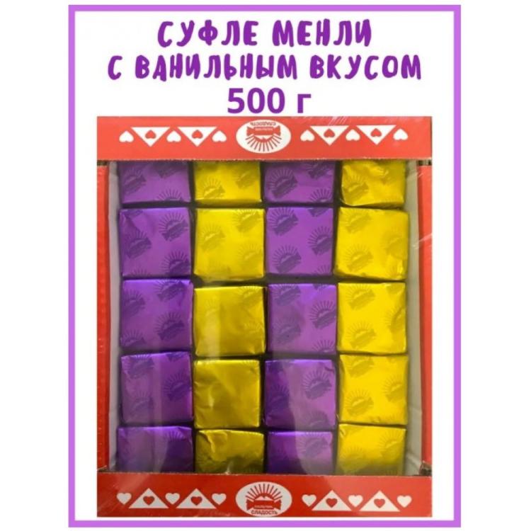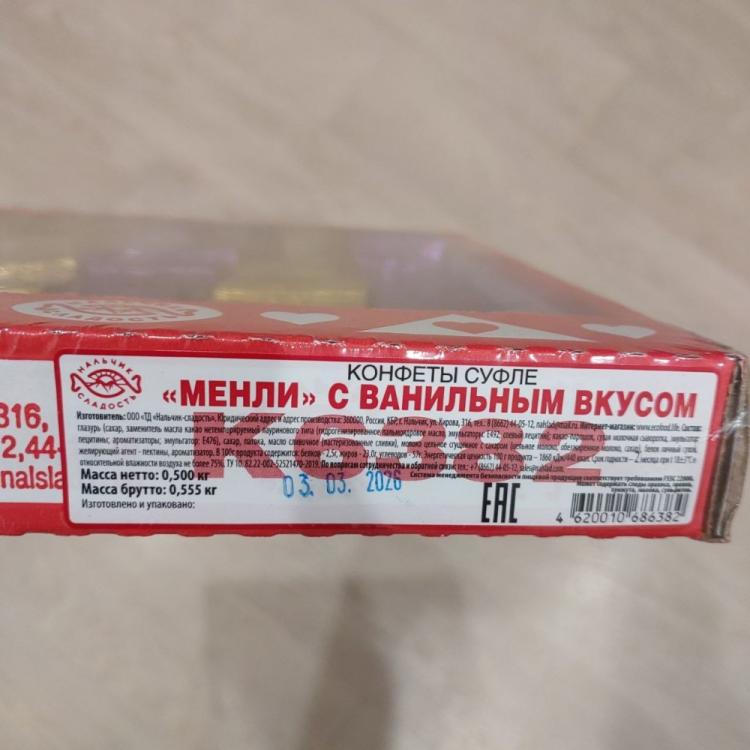 Конфеты Суфле Менли (раньше назывались Птица Менли) производятся фабрикой Нальчик-Сладость. По вкусу они похожи на известные конфеты Птичье молоко. Форма десерта квадратная 5х5 см. Воздушное суфле покрыто слоем шоколадной глазури. Конфеты можно взять с собой на прогулку, в дорогу, в школу для перекуса или отведать с чаем или кофе. Это вкусное лакомство для взрослых и детей. Конфеты в ярких обертках, в коробке, могут быть подарком по любому поводу. Производятся по собственной рецептуре, из натурального сырья, без применения ГМО продуктов. Суфле Менли с ванильным вкусом - это те же конфеты, как были раньше, с белым суфле, только название немного изменилось и обертки не разноцветные, а двух цветов.