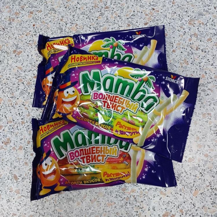Жевательные конфеты Mamba Волшебный твист 1 кг весом В 1 пачке 70 грамм = 7 палочек Состав: Сахар, глюкозный сироп, растительное масло, агент влагоудерживающий сорбитовый сироп (Е 420ii), желатин, регулятор кислотности лимонная кислота (Е330), ароматизаторы, концентрат черной моркови, концентрат спирулины, краситель куркумин (Е100), концентрированный сок клубники, пюре из черной смородины.