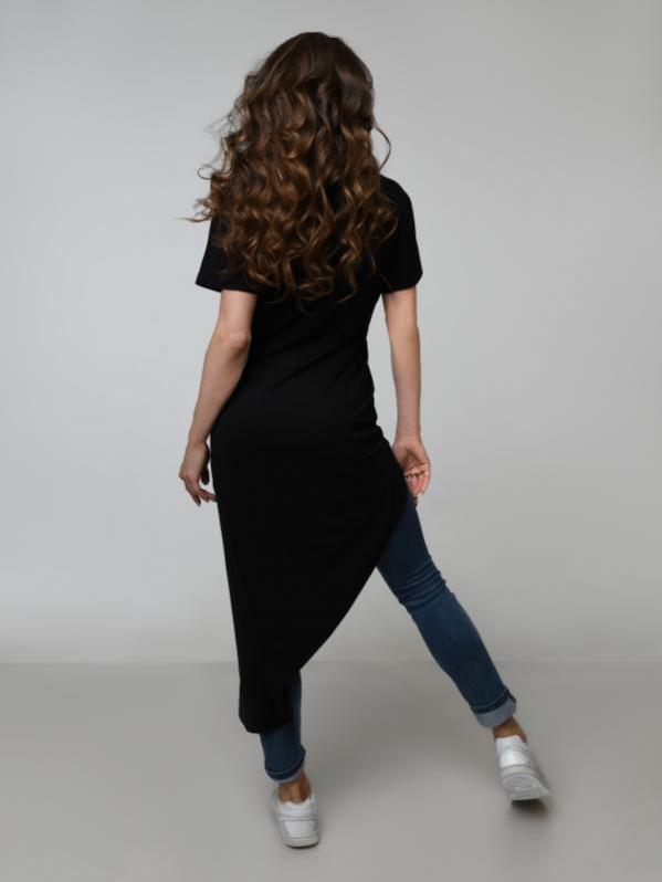 Туника прямого кроя, спущенный свободный короткий рукав. Спереди подрез на уровне талии с заложенными аккуратными складками на верхней и на нижней деталях. Нижняя деталь спереди выполнена по типу юбки с запахом. Туника имеет ассиметричный низ длиной до щи