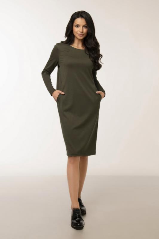 Модель прямого силуэта свободного кроя из мягкого трикотажного материала. Длинные втачные рукава, горловина «лодочка», карманы в декоративных швах по полочке, длина до колена