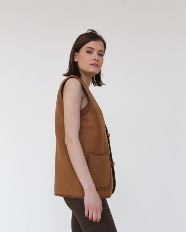 Валяный жилет из натуральной верблюжьей шерсти — это тёплое, функциональное и универсальное изделие для холодного времени года и межсезонья. Он создан для комфортной повседневной носки, сочетая природное тепло, простоту формы и практичность. Материал и ценность: Верблюжья шерсть известна своими уникальными теплоизоляционными свойствами и способностью сохранять сухое тепло. Натуральный материал дышащий, лёгкий и комфортный, помогает поддерживать оптимальную температуру тела и подходит для чувствительной кожи. Технология валяния: Валяная структура делает жилет плотным и устойчивым к ветру, при этом он остаётся мягким и приятным на ощупь. Такой способ обработки повышает износостойкость изделия и позволяет ему долго сохранять форму. Дизайн: Прямой лаконичный крой без рукавов обеспечивает свободу движений и удобство в носке. Глубокий V-образный вырез, аккуратная отделка по краю и застёжка на пуговицы создают сдержанный, универсальный образ. Накладные карманы добавляют функциональности. Цвет: Тёплый натуральный ко
