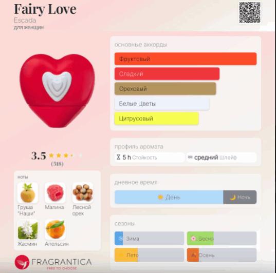 Escada Fairy Love — легкий, нежный, волнующий и романтичный женский сладкий цветочно-фруктовый аромат, выпущенный в 2021 году немецким модным домом Escada. Аромат станет прекрасным дополнением женского образа в стиле бренда Эскада. Оригинальный флакон в форме сердца идеально отражает особую энергетику заключенного в нем парфюма.