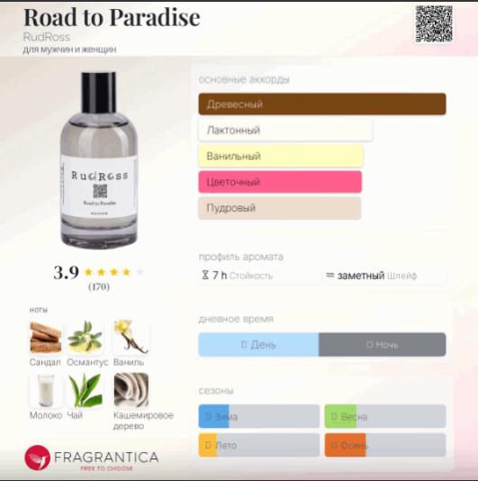 Ароматическая композиция начинает звучание с тонкого пряного аромата белого чая и душистых цветочных нот османтуса. В сердечном аккорде шелковисто-пряный аромат апельсинового цвета звучит на фоне теплого бархатисто-сливочного сандала. А завершают композицию RudRoss Road To Paradise мягкие древесные мотивы, кашмеран, сливочные оттенки молока и ваниль. Соблазнительные сладкие ноты стручков ванили сочетаются с роскошным ароматом сандалового дерева, придавая композиции особую роскошь и эксклюзивность звучания.
