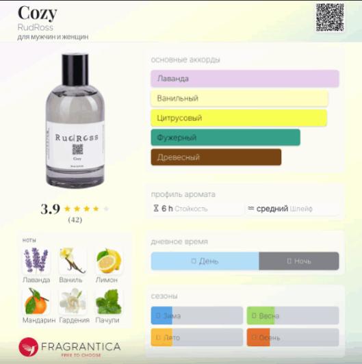 RudRoss Cozy — мягкий, чувственный и умиротворяющий восточно-древесный унисекс-парфюм, выпущенный в 2023 году британским нишевым парфюмерным брендом RudRoss. Аромат посвящен йоге и медитации, а также состоянию спокойствия и внутреннего баланса, которое предлагают эти практики. Чистая и уютная ароматическая композиция подобна второй коже, она окутывает пеленой спокойствия и умиротворения, помогает сконцентрироваться на важных делах, отбросив суету.