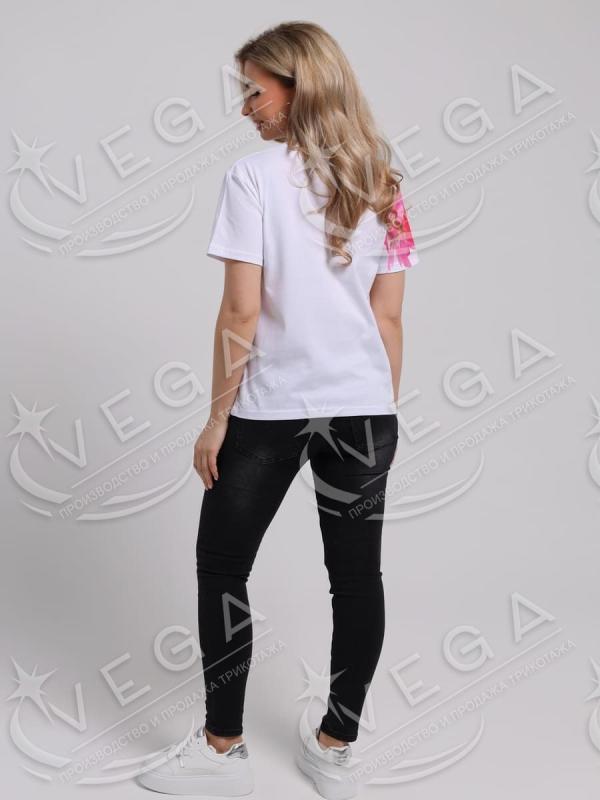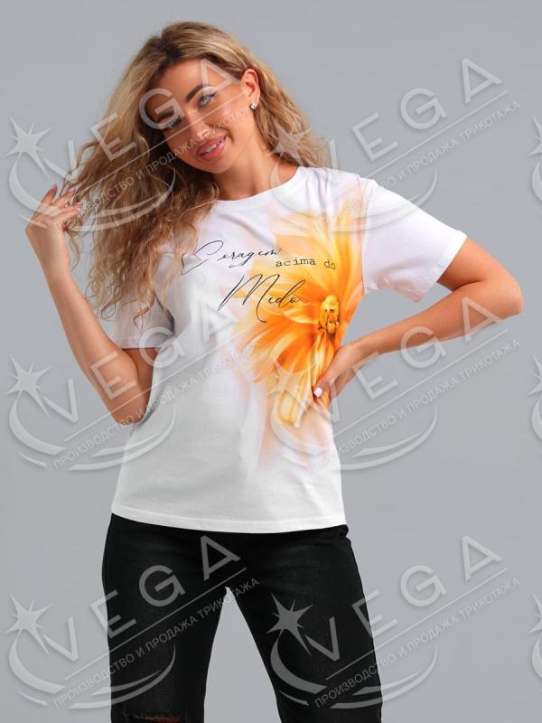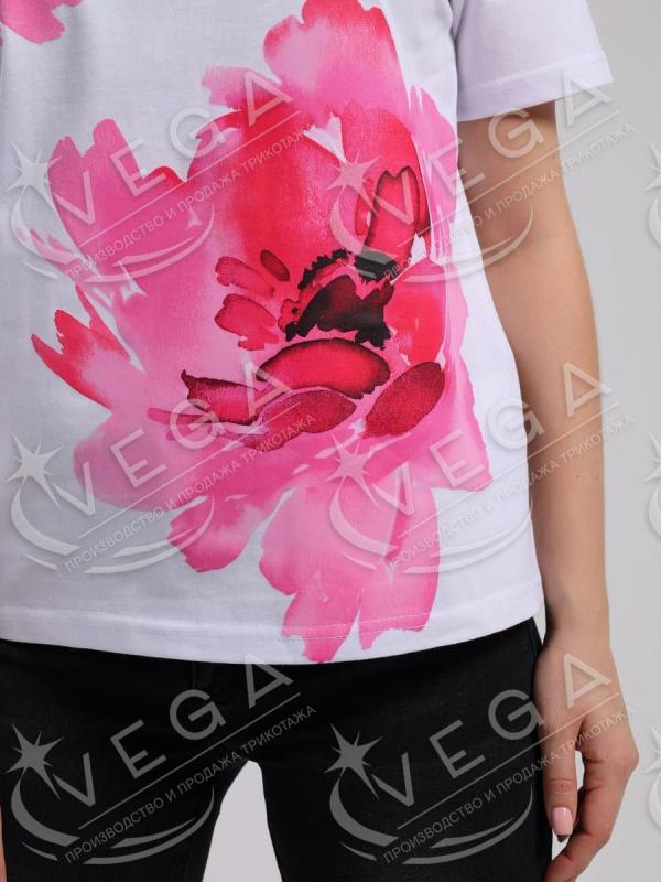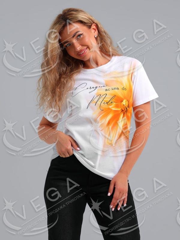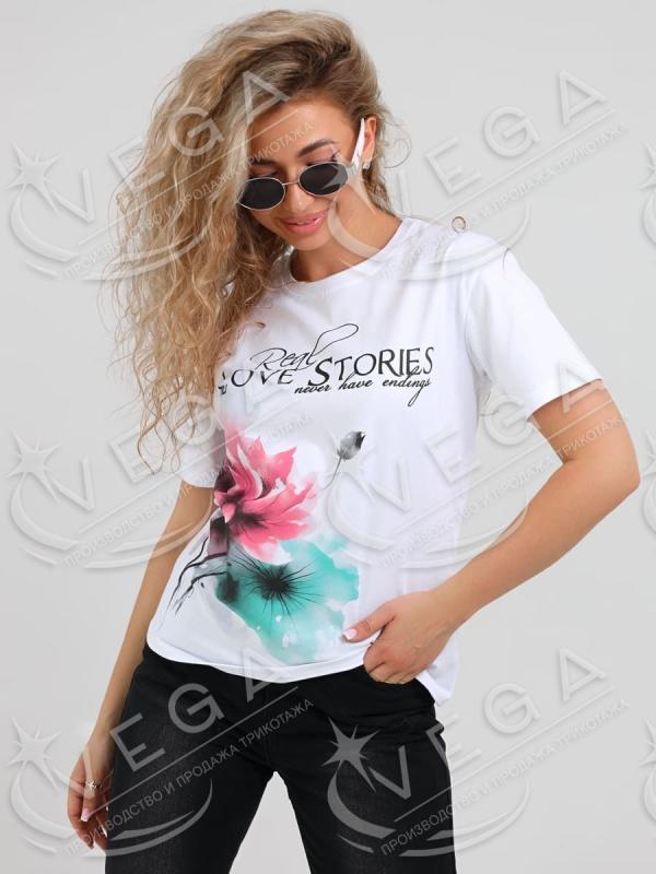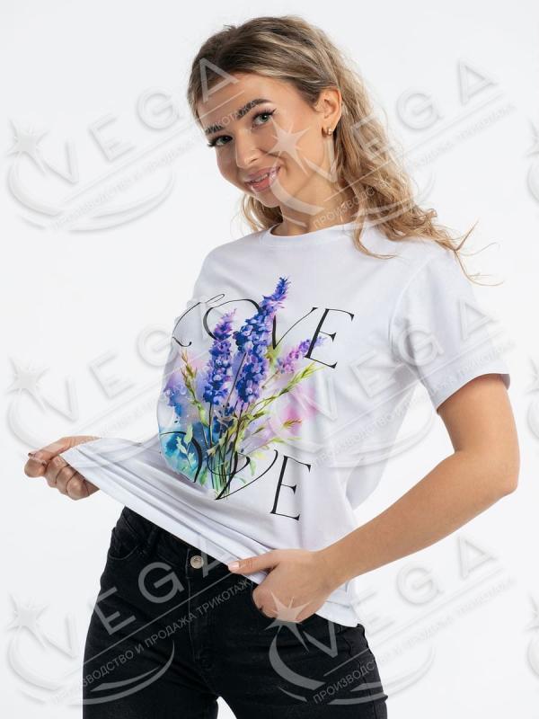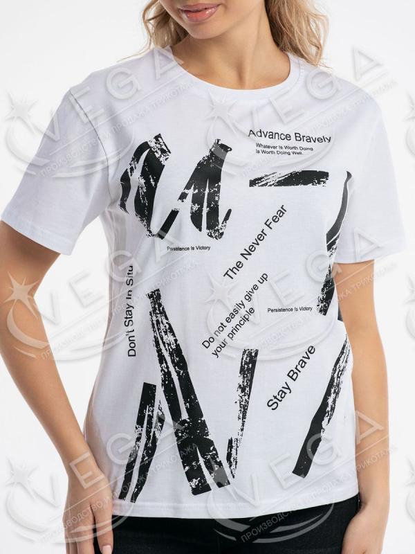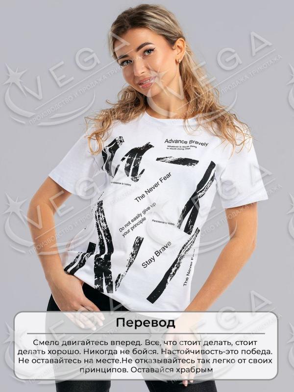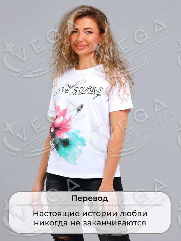 Футболка классического фасона, сшита из ткани кулирка с лайкрой, с округлым вырезом с усилением горловины. Она мягкая, приятная к телу и на ощупь, не нарушает воздухообмен, поэтому в ней тепло, когда на улице прохладно и комфортно в жарком помещении. Небольшое количество лайкры в составе ткани продлит изделию жизнь и не даст потерять вид нового товара, так как обладает уникальной способностью к растяжению и восстановлению формы. Такая модель станет прекрасным дополнением вашего гардероба. Она отлично подойдет для любого образа. Большой выбор из ассортимента моделей с разными принтами поможет вам выбрать любимую. Надев футболку с пиджаком, Вы создадите образ деловой и стильной девушки. Если Вы решите надеть ее с джинсами и кроссовками и отправиться на прогулку, то получится образ утончённый и романтический. Каждая из них по своему хороша. Стильный принт делает модель индивидуальной и заметной. Уважаемые покупатели! Обращаем Ваше внимание, что цветовая гамма изделий может отл