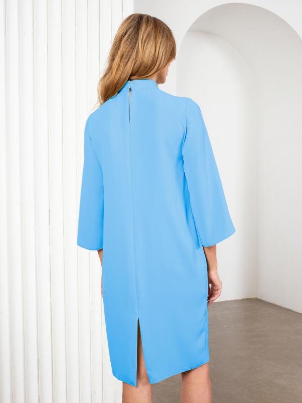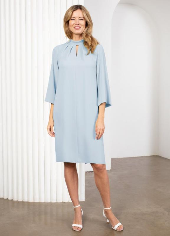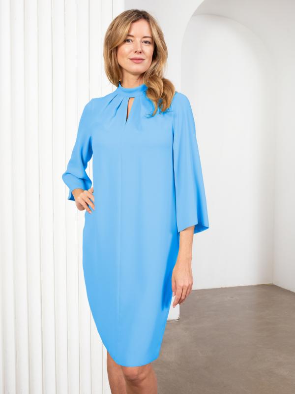 Состав: 53% полиэстер, 47% вискоза Платье из мягкого пластичного крепа. Прямой силуэт, слегка зауженный книзу. Воротник стойка, защипы по горловине. Рукава клеш, длиной 3-4. Застёжка на спинке на пуговицы. Разрез в среднем шве спинки. Длина миди.