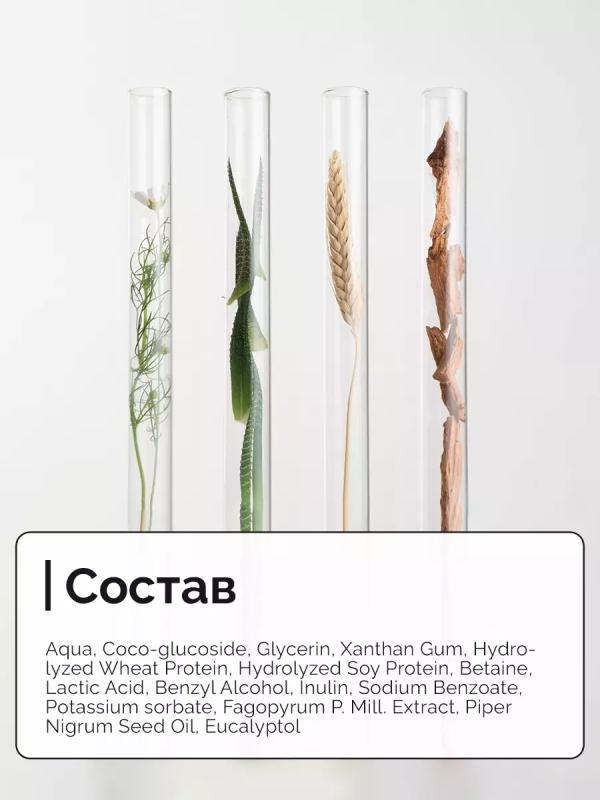 Aqua (Вода), Coco-glucoside (Мягкий ПАВ из кокосового масла), Aloe Barbadensis Leaf Juice* (Алоэ вера сок), Sodium Chloride (Морская соль), Glycerin (Глицерин), Xanthan gum (Ксантановая камедь), Hydrolyzed Soy Protein (Протеины сои), Arctium lappa root extract (Репейное масло), Citric Acid (Лимонная кислота), Benzyl Alcohol (Бензиловый спирт), Mentha Arvensis oil (Эфирное масло мяты), Inulin (Инулин), Potassium Sorbate (Сорбат калия), Sodium Benzoate (Бензоат натрия), Juniperus communis Fruit Oil (Эфирное масло можжевельника), Piper Nigrum Seed Oil (Эфирное масло черного перца), Fagopyrum P. Mill. Extract (Экстракт гречихи), Ginkgo biloba L. Extract (Экстракт гинкго-билоба).