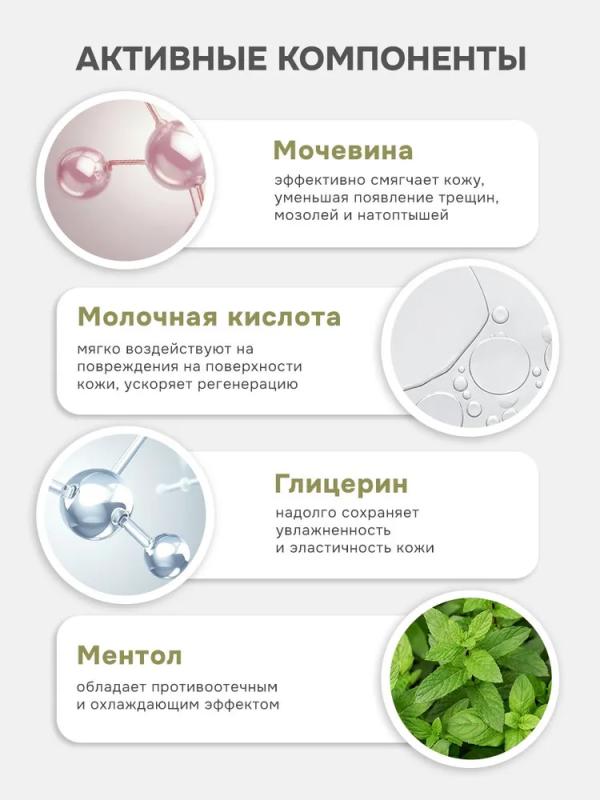 • Мочевина эффективно смягчает кожу , уменьшая появление трещин, мозолей и натоптышей